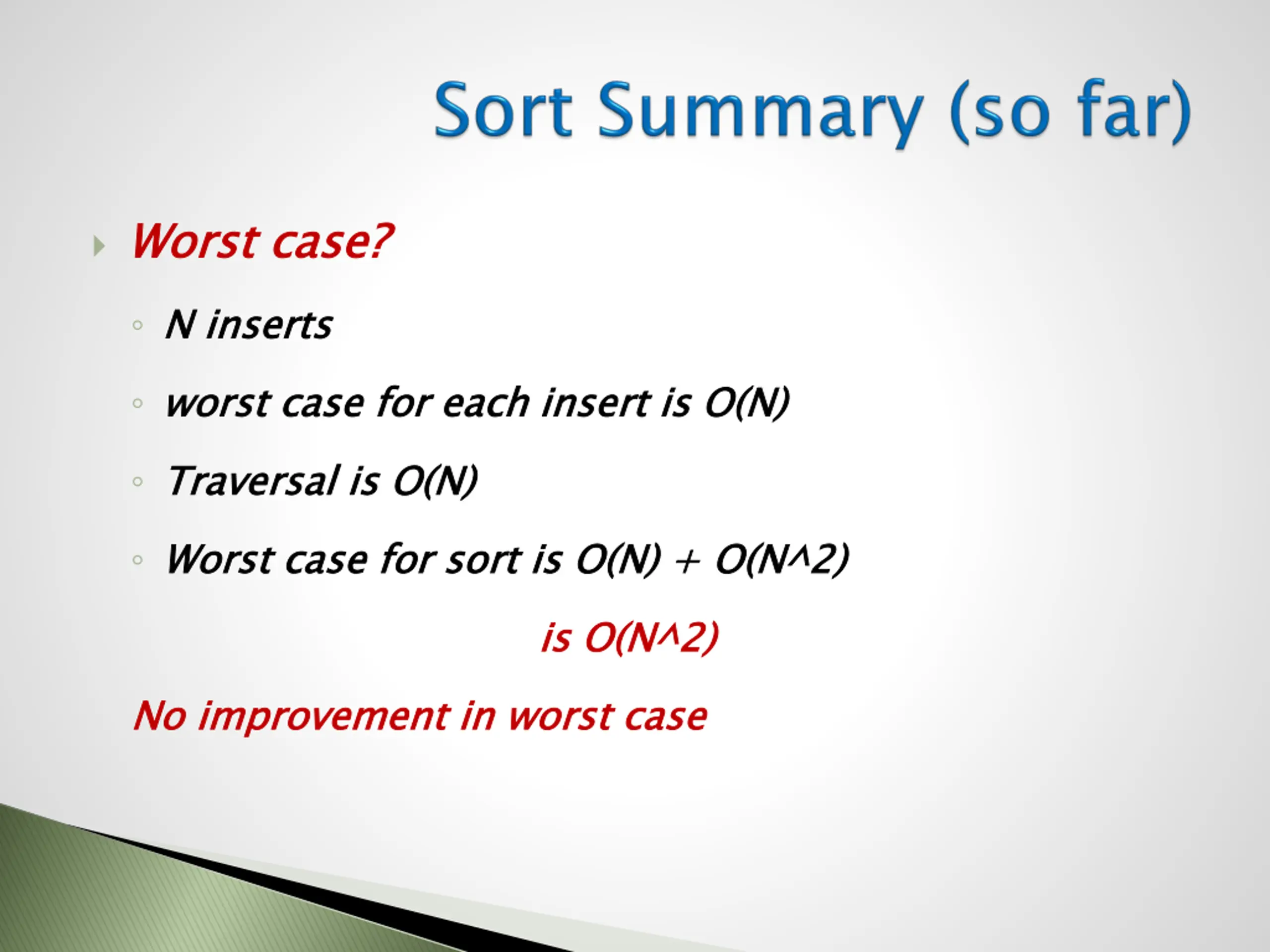 Worst case? N inserts worst case for each insert is O(N) Traversal is O(N) Worst case for sort is O(N) + O(N^2) No improvement in worst case Worst case? N inserts worst case for each insert is O(N) Traversal is O(N) Worst case for sort is O(N) + O(N^2) is O(N^2) is O(N^2) No improvement in worst case