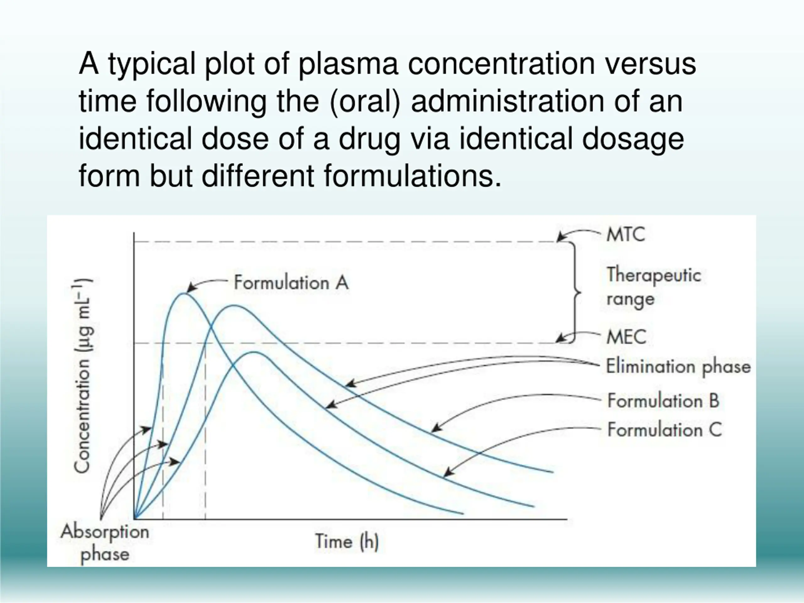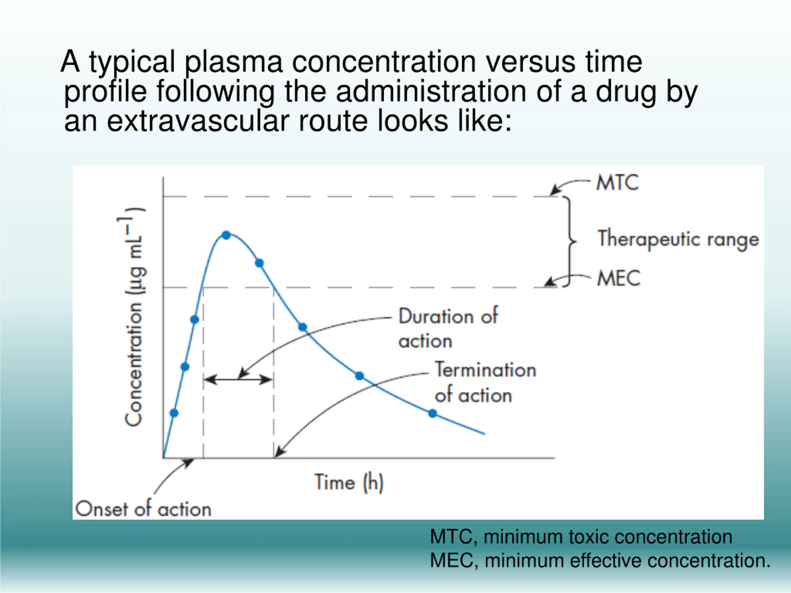 A typical plasma concentration versus time profile following the administration of a drug by an extravascular route looks like: MTC, minimum toxic concentration MEC, minimum effective concentration.