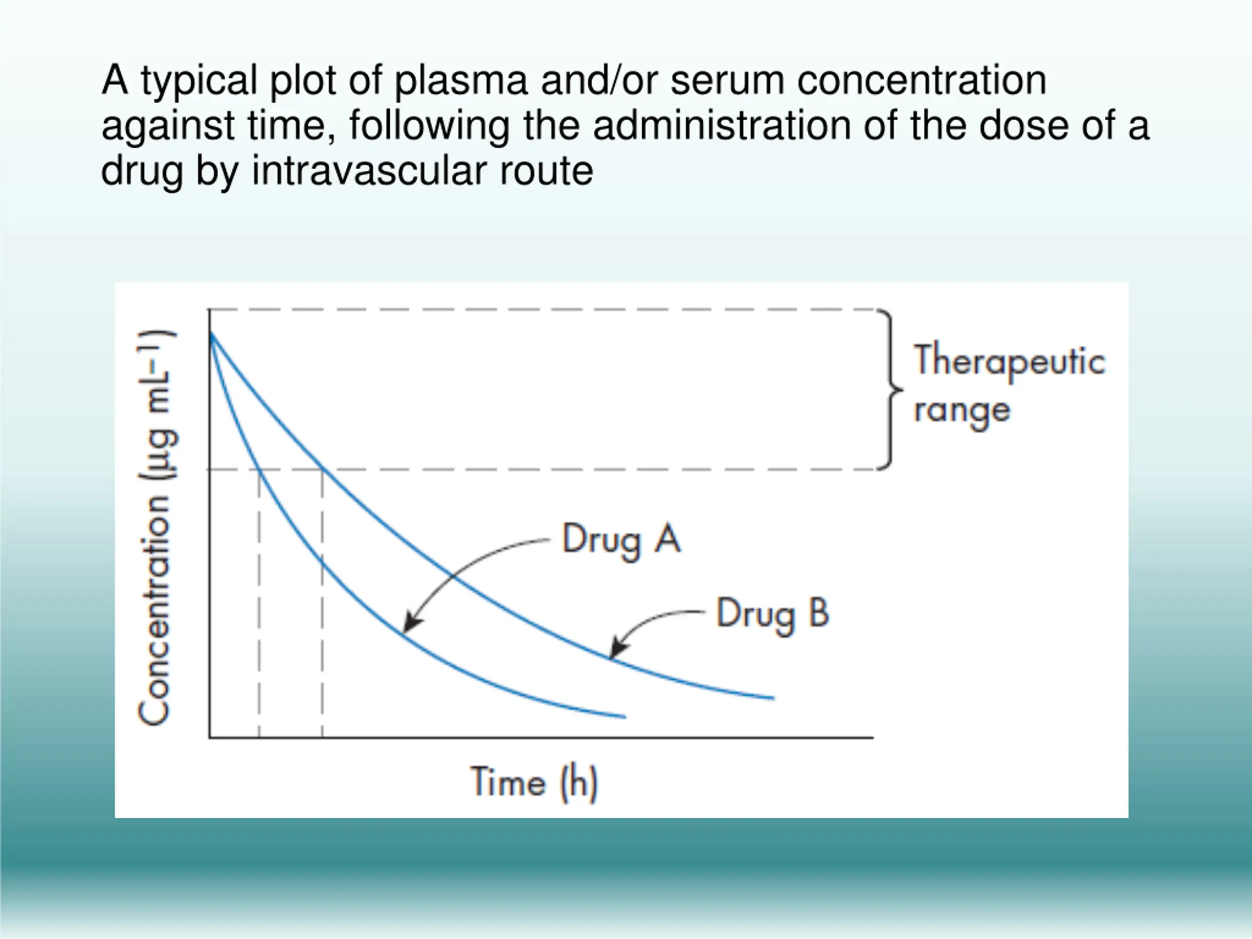 A typical plot of plasma and/or serum concentration against time, following the administration of the dose of a drug by intravascular route