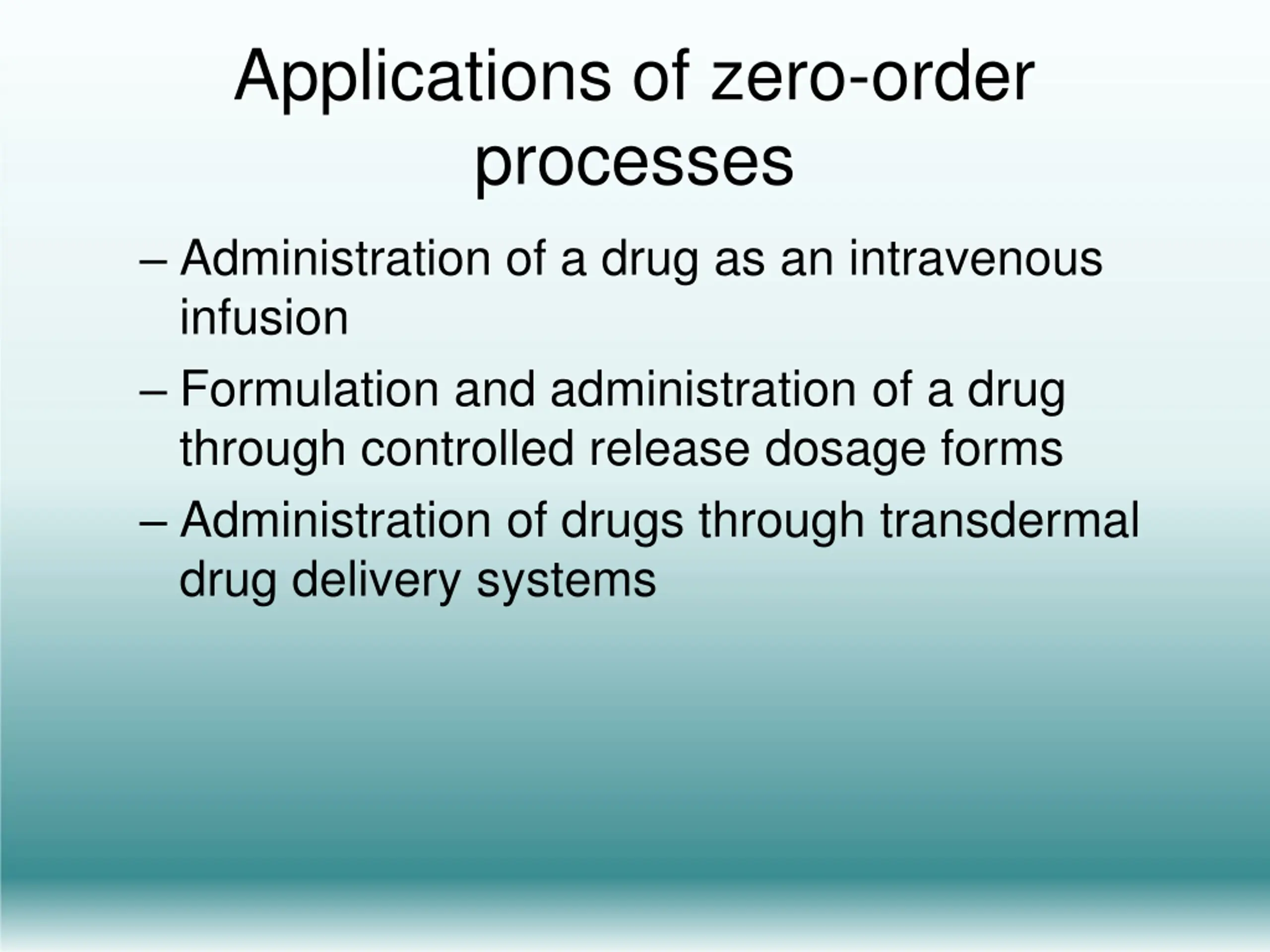 Applications of zero-order processes Administration of a drug as an intravenous infusion Formulation and administration of a drug through controlled release dosage forms Administration of drugs through transdermal drug delivery systems