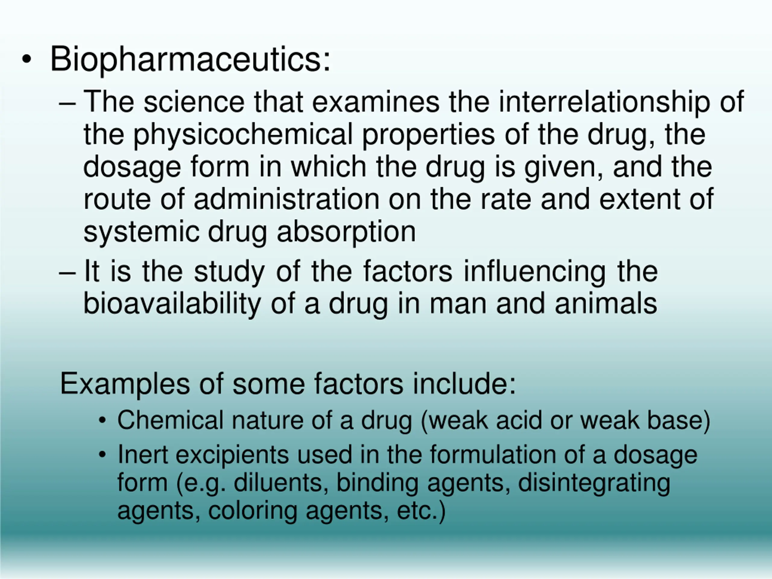 Biopharmaceutics: The science that examines the interrelationship of the physicochemical properties of the drug, the dosage form in which the drug is given, and the route of administration on the rate and extent of systemic drug absorption It is the study of the factors influencing the bioavailability of a drug in man and animals Examples of some factors include: Chemical nature of a drug (weak acid or weak base) Inert excipients used in the formulation of a dosage form (e.g. diluents, binding agents, disintegrating agents, coloring agents, etc.)