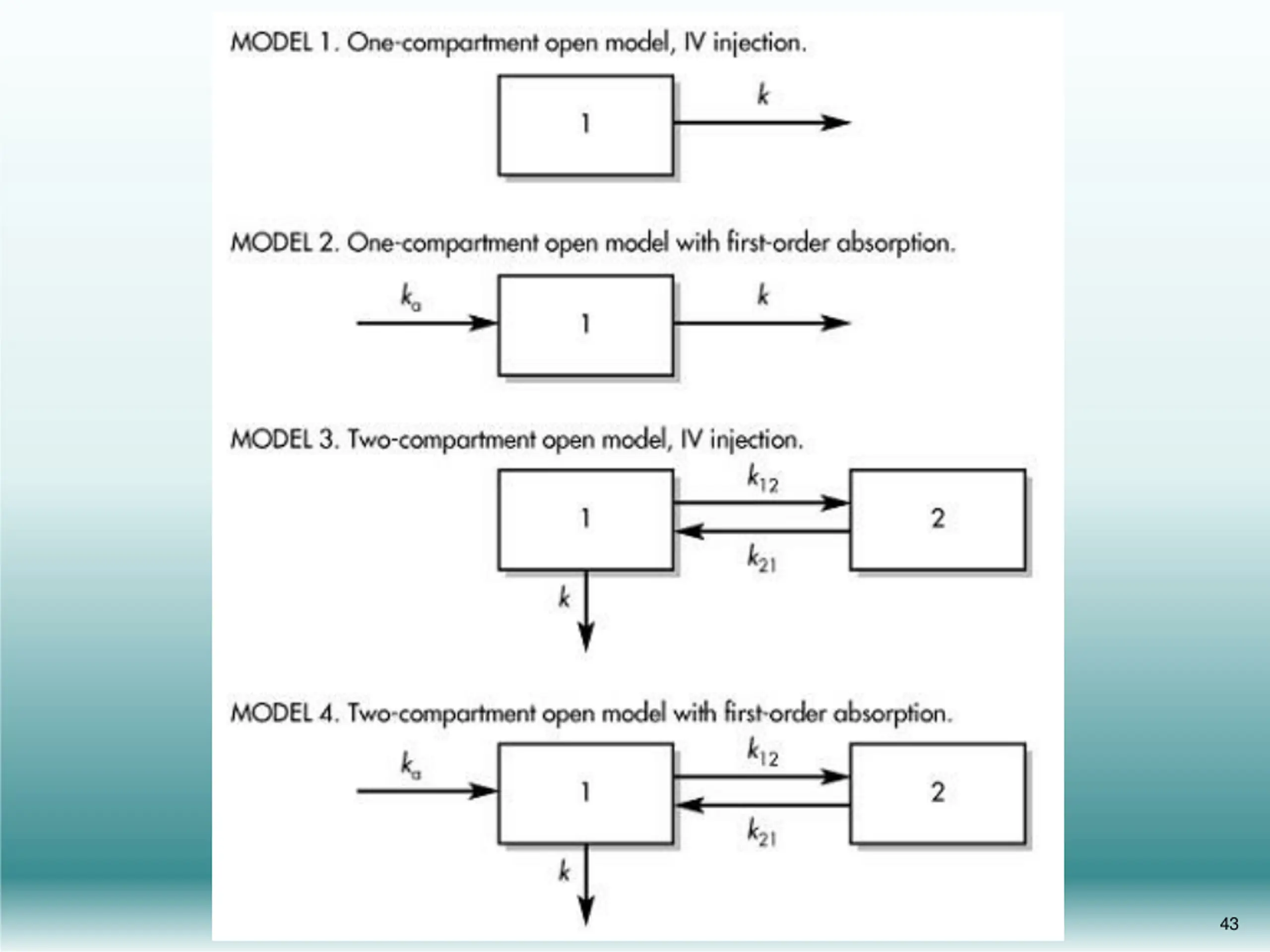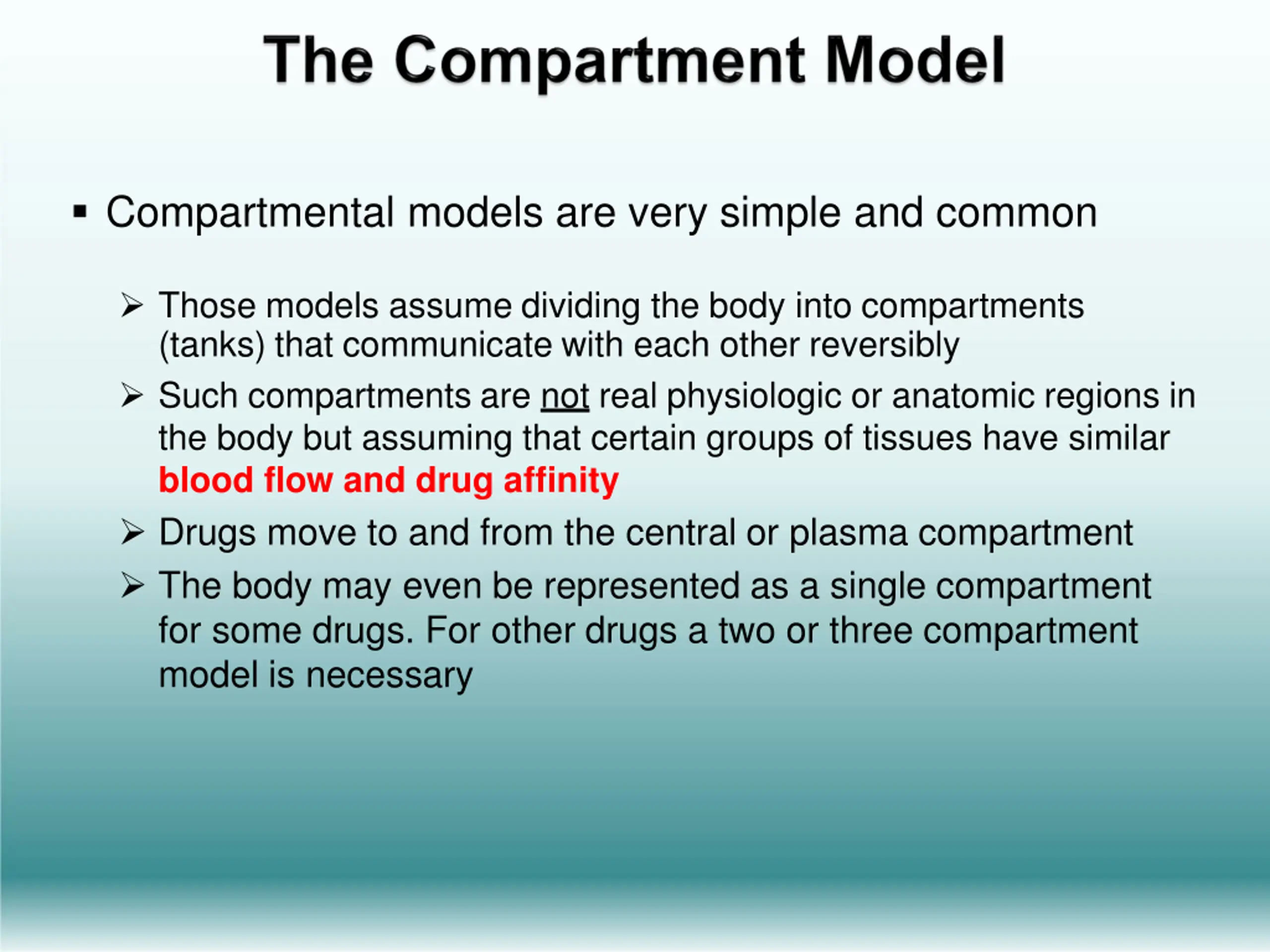 Compartmental models are very simple and common Those models assume dividing the body into compartments (tanks) that communicate with each other reversibly Such compartments are not real physiologic or anatomic regions in the body but assuming that certain groups of tissues have similar blood flow and drug affinity Drugs move to and from the central or plasma compartment The body may even be represented as a single compartment for some drugs. For other drugs a two or three compartment model is necessary