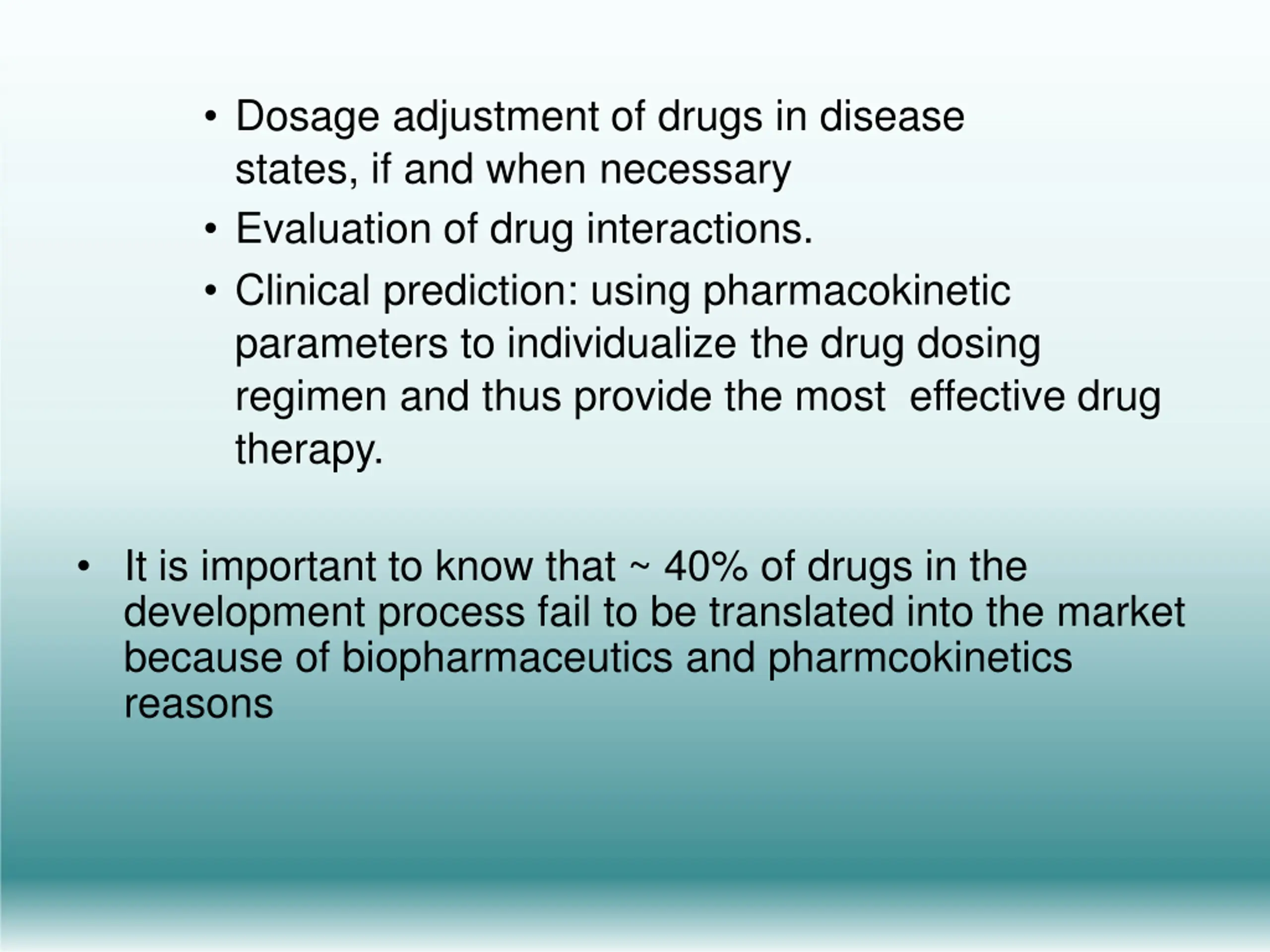 Dosage adjustment of drugs in disease states, if and when necessary Evaluation of drug interactions. Clinical prediction: using pharmacokinetic parameters to individualize the drug dosing regimen and thus provide the most effective drug therapy. It is important to know that ~ 40% of drugs in the development process fail to be translated into the market because of biopharmaceutics and pharmcokinetics reasons
