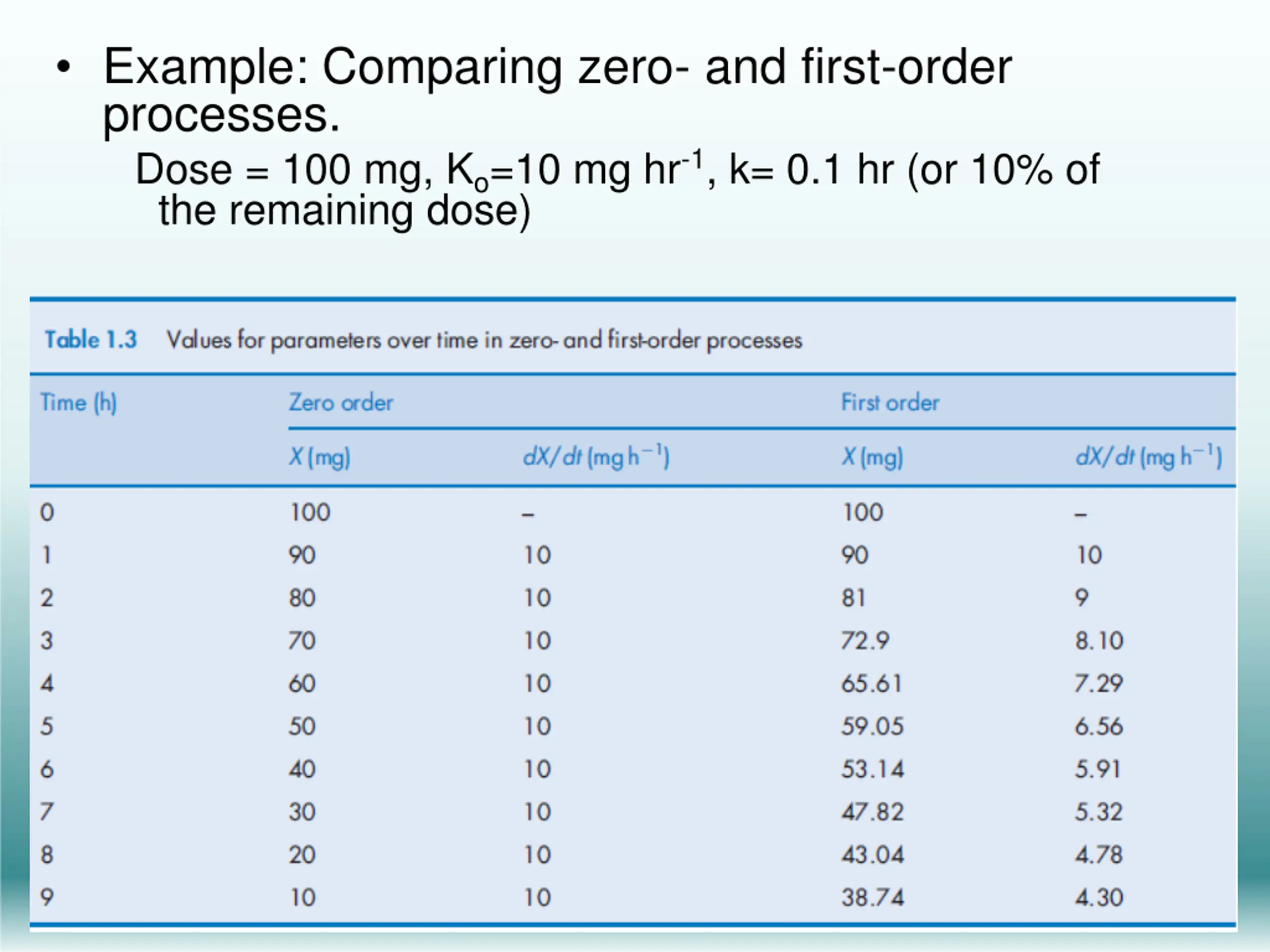 Example: Comparing zero- and first-order processes. Dose = 100 mg, Ko=10 mg hr-1, k= 0.1 hr (or 10% of the remaining dose)