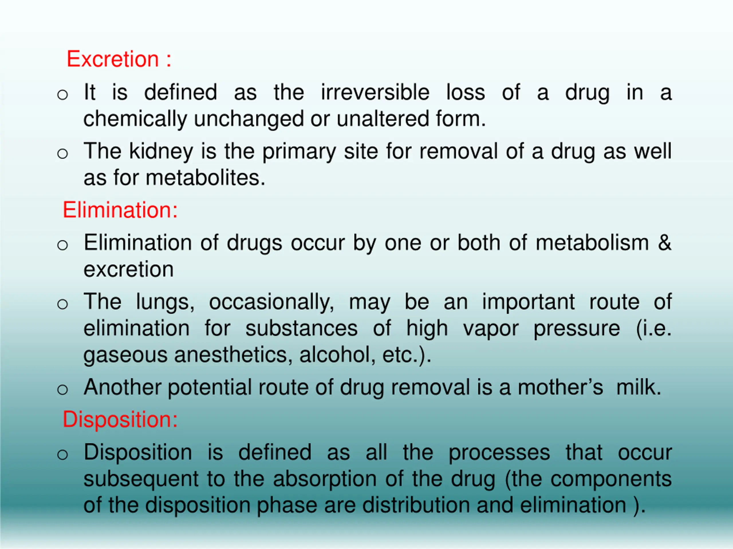 Excretion : o It is defined as the irreversible loss of a drug in a chemically unchanged or unaltered form. o The kidney is the primary site for removal of a drug as well as for metabolites. Elimination: o Elimination of drugs occur by one or both of metabolism & excretion o The lungs, occasionally, may be an important route of elimination for substances of high vapor pressure (i.e. gaseous anesthetics, alcohol, etc.). o Another potential route of drug removal is a mother s milk. Disposition: o Disposition is defined as all the processes that occur subsequent to the absorption of the drug (the components of the disposition phase are distribution and elimination ).