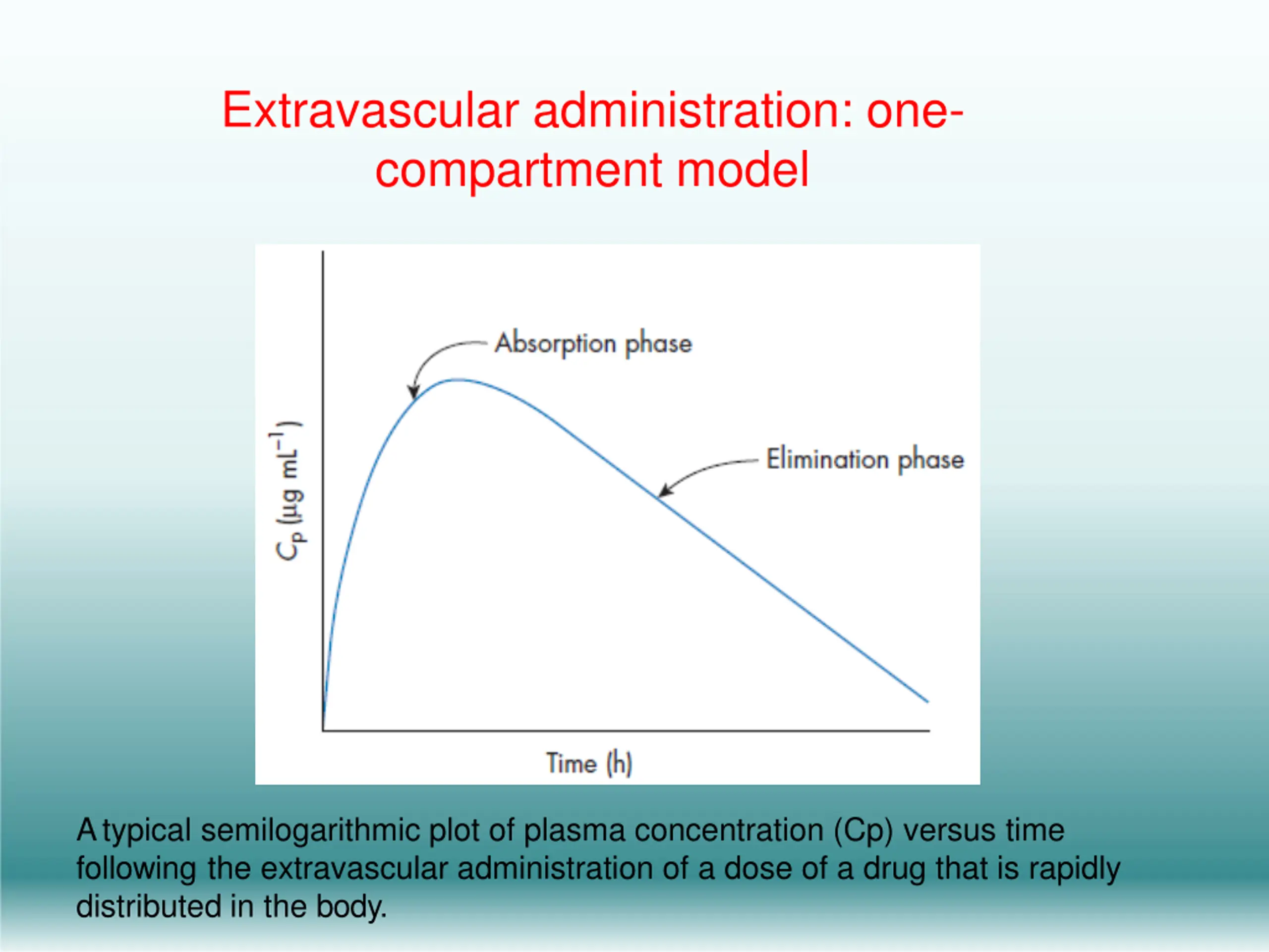 Extravascular administration: one- compartment model Atypical semilogarithmic plot of plasma concentration (Cp) versus time following the extravascular administration of a dose of a drug that is rapidly distributed in the body.