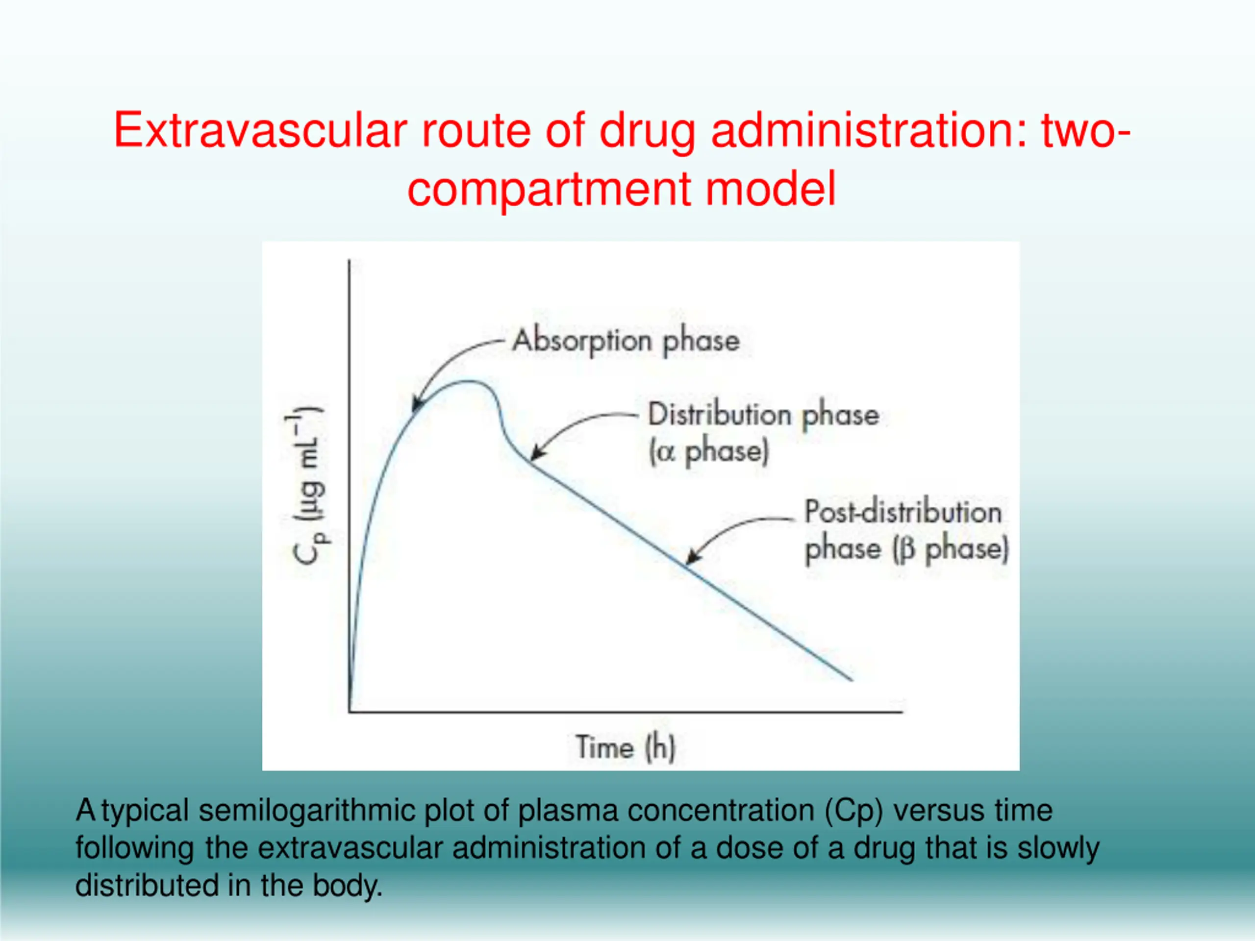 Extravascular route of drug administration: two- compartment model Atypical semilogarithmic plot of plasma concentration (Cp) versus time following the extravascular administration of a dose of a drug that is slowly distributed in the body.