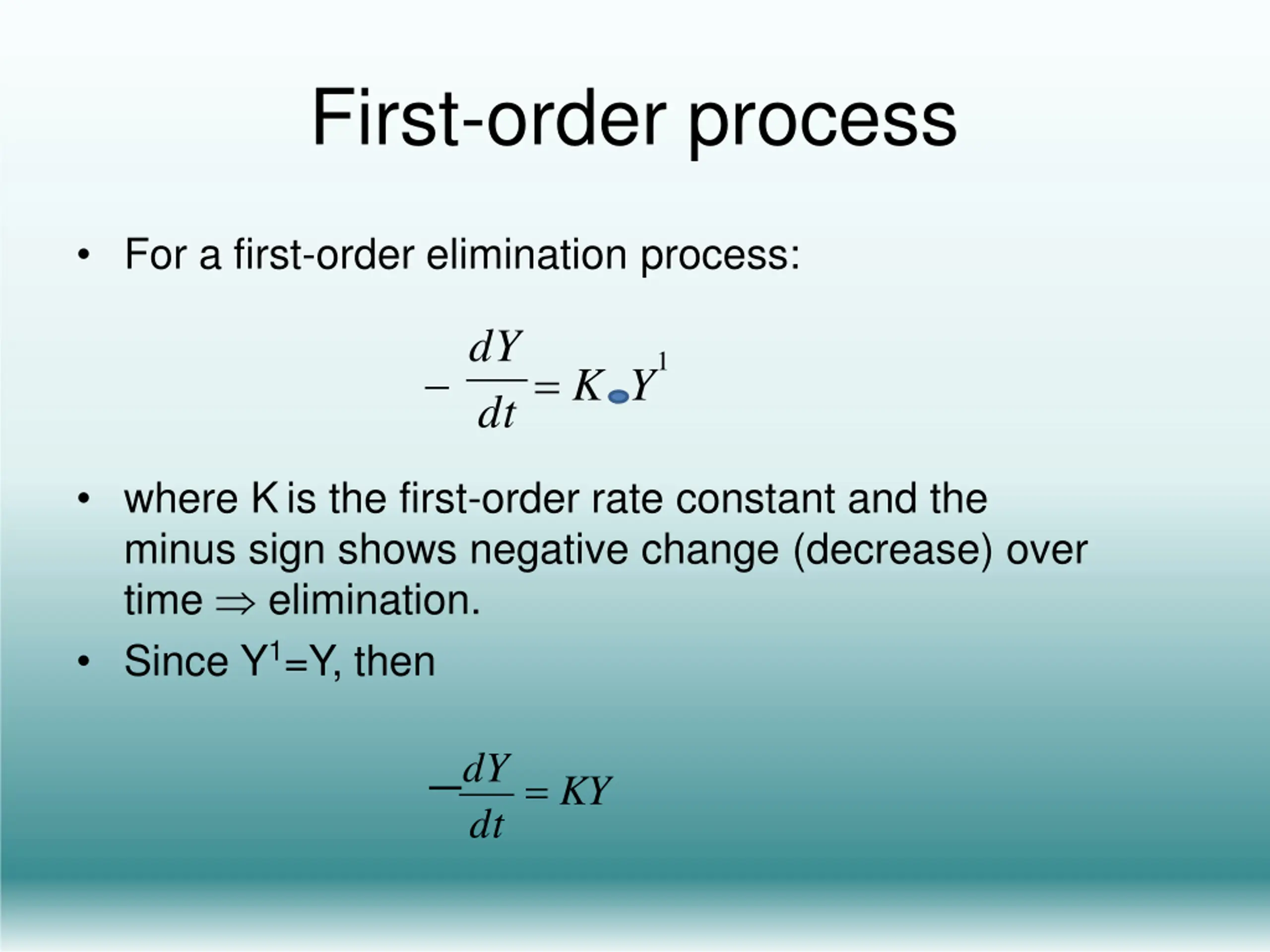 First-order process For a first-order elimination process: dY 1 = K Y o dt where Kis the first-order rate constant and the minus sign shows negative change (decrease) over time elimination. Since Y1=Y, then dY= KY dt