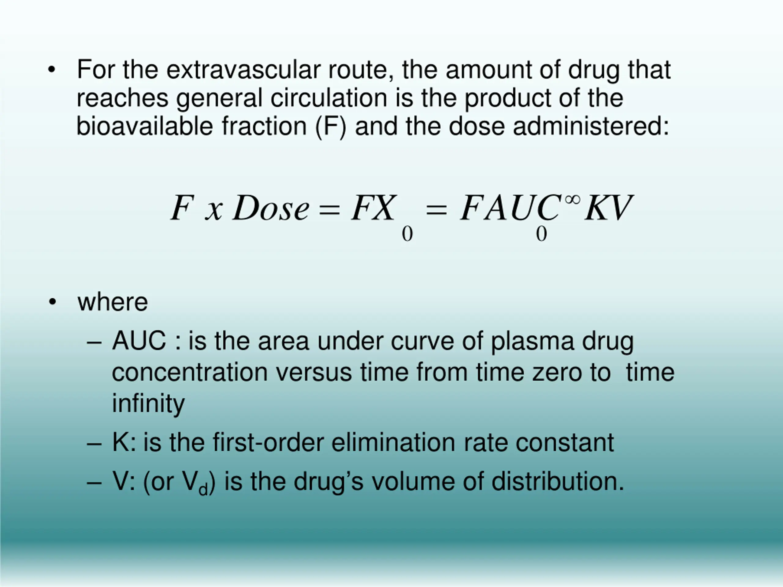 For the extravascular route, the amount of drug that reaches general circulation is the product of the bioavailable fraction (F) and the dose administered: F x Dose = FX = FAUC KV 0 0 where AUC : is the area under curve of plasma drug concentration versus time from time zero to time infinity K: is the first-order elimination rate constant V: (or Vd) is the drug s volume of distribution.