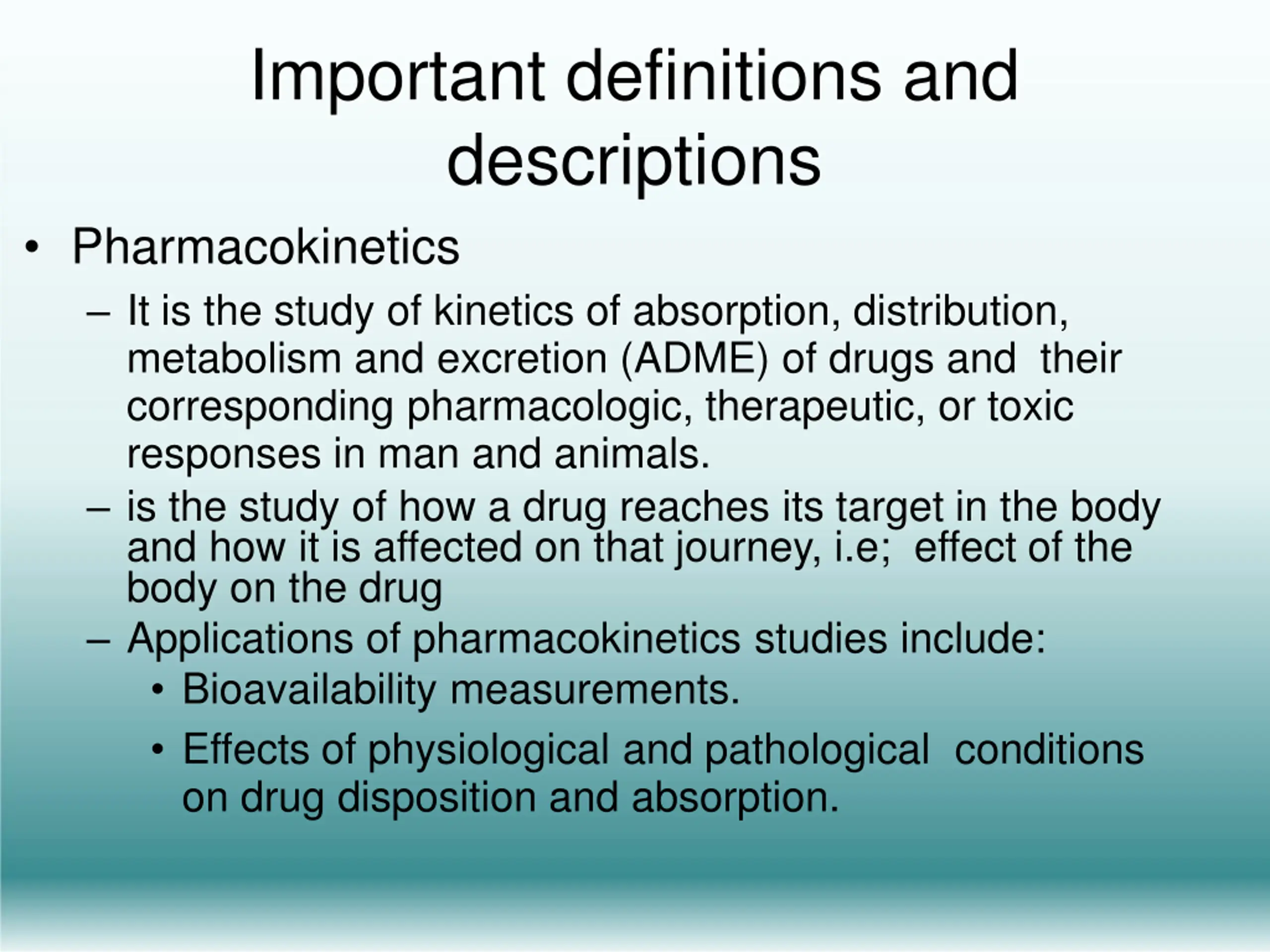 Important definitions and descriptions Pharmacokinetics It is the study of kinetics of absorption, distribution, metabolism and excretion (ADME) of drugs and their corresponding pharmacologic, therapeutic, or toxic responses in man and animals. is the study of how a drug reaches its target in the body and how it is affected on that journey, i.e; effect of the body on the drug Applications of pharmacokinetics studies include: Bioavailability measurements. Effects of physiological and pathological conditions on drug disposition and absorption.