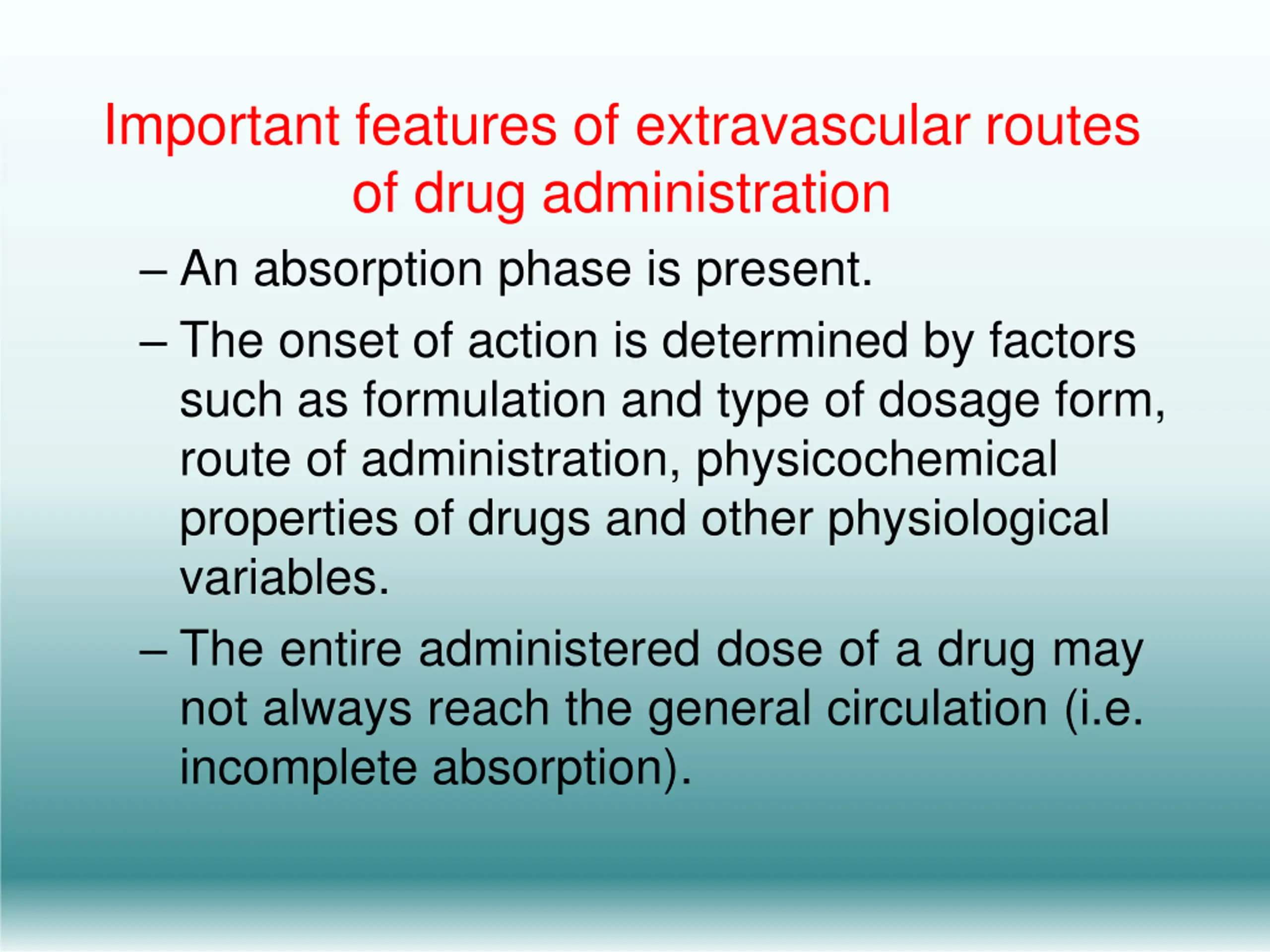 Important features of extravascular routes of drug administration An absorption phase is present. The onset of action is determined by factors such as formulation and type of dosage form, route of administration, physicochemical properties of drugs and other physiological variables. The entire administered dose of a drug may not always reach the general circulation (i.e. incomplete absorption).