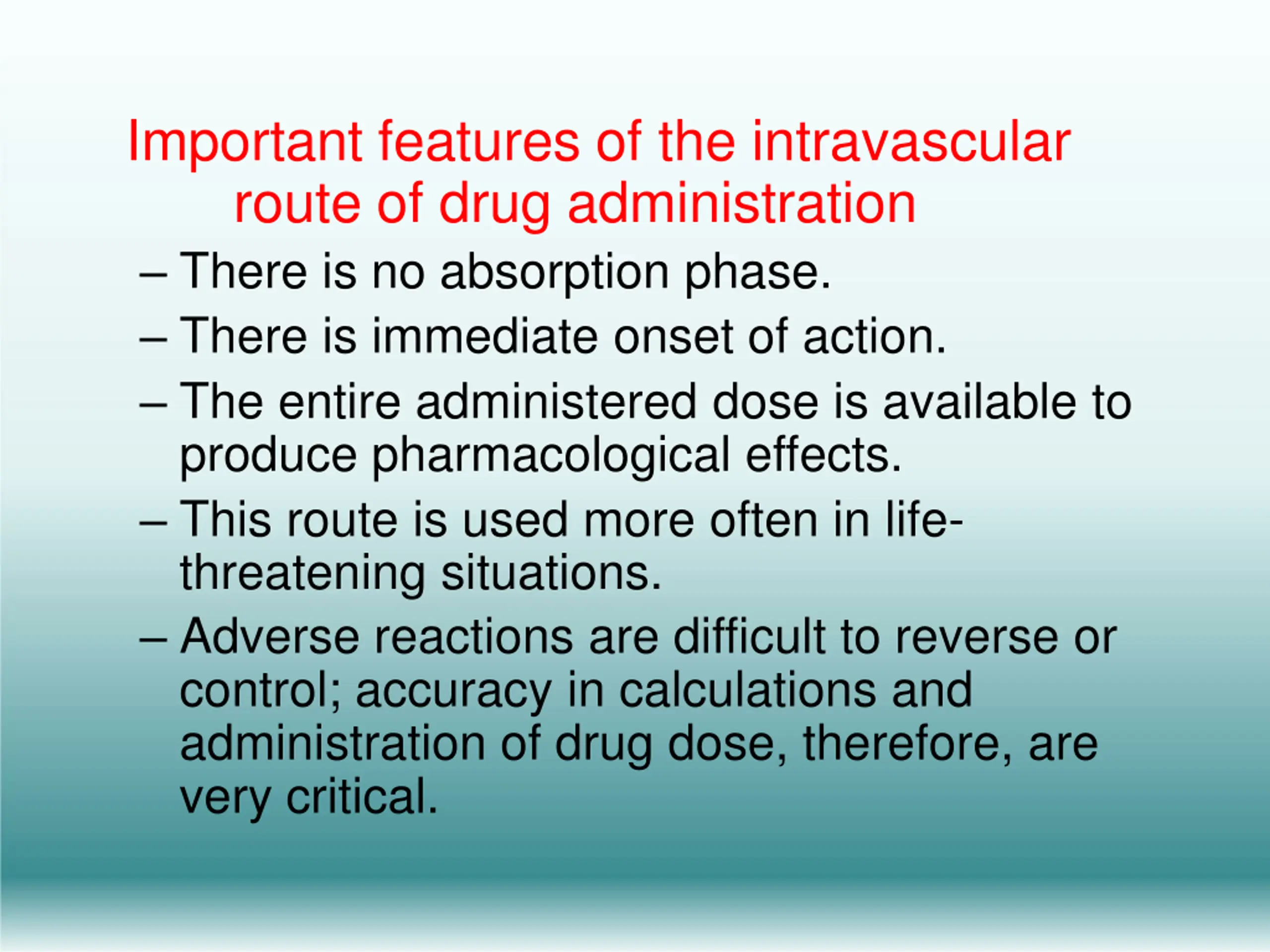 Important features of the intravascular route of drug administration There is no absorption phase. There is immediate onset of action. The entire administered dose is available to produce pharmacological effects. This route is used more often in life- threatening situations. Adverse reactions are difficult to reverse or control; accuracy in calculations and administration of drug dose, therefore, are very critical.