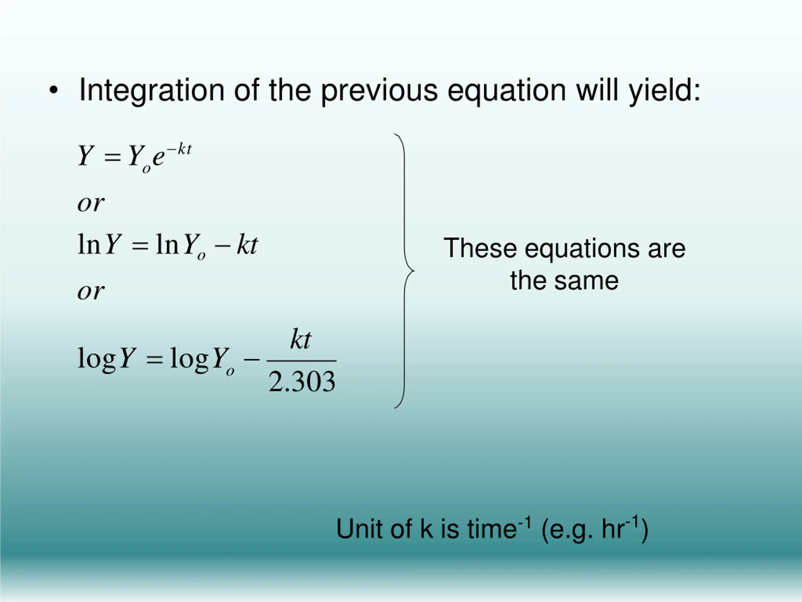 Integration of the previous equation will yield: Y =Y e kt o or lnY = lnYo kt or These equations are the same kt logY = logY o 2.303 Unit of k is time-1(e.g. hr-1)