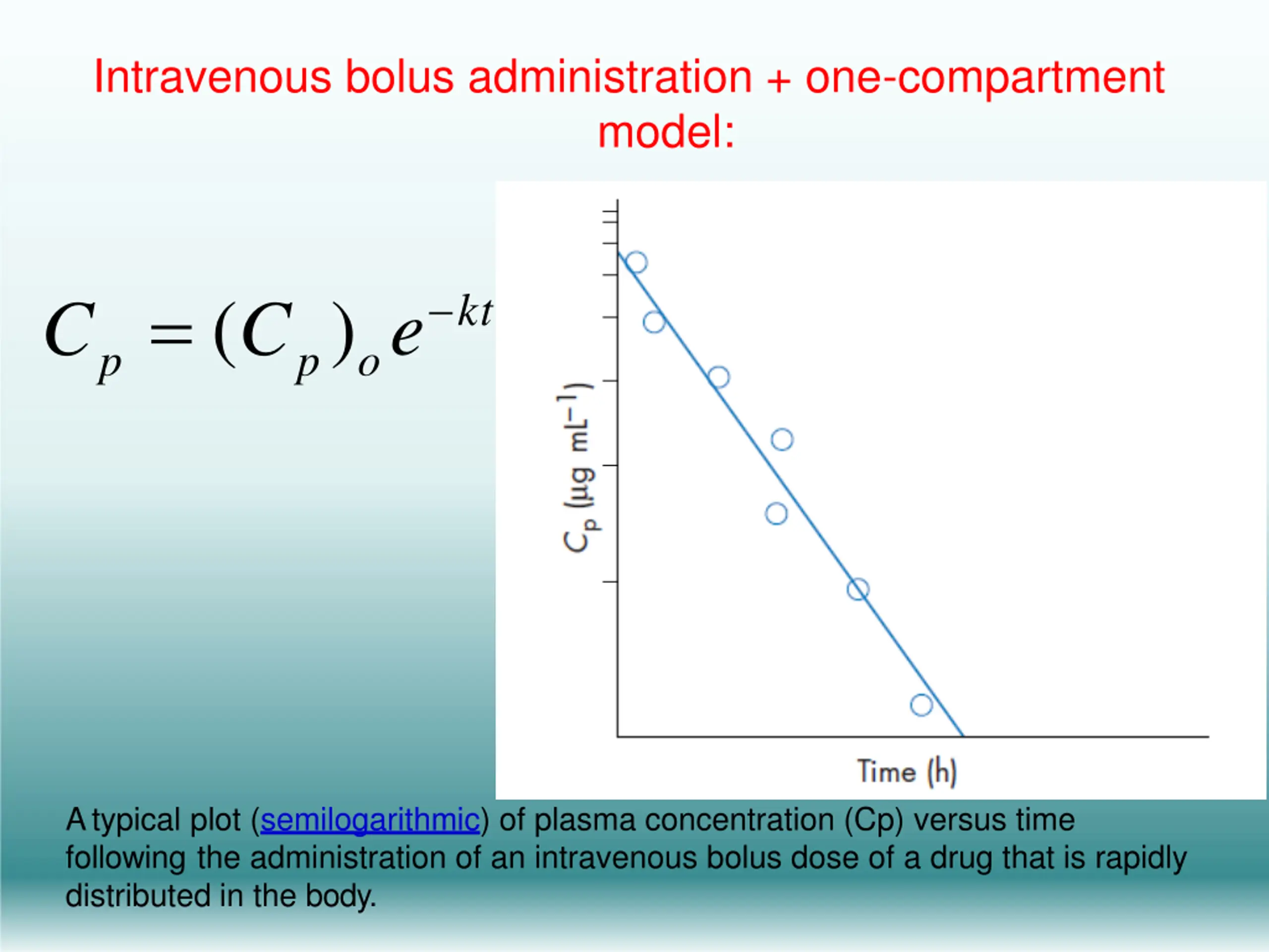 Intravenous bolus administration + one-compartment model: C = (C ) e kt p p o Atypical plot (semilogarithmic) of plasma concentration (Cp) versus time following the administration of an intravenous bolus dose of a drug that is rapidly distributed in the body.