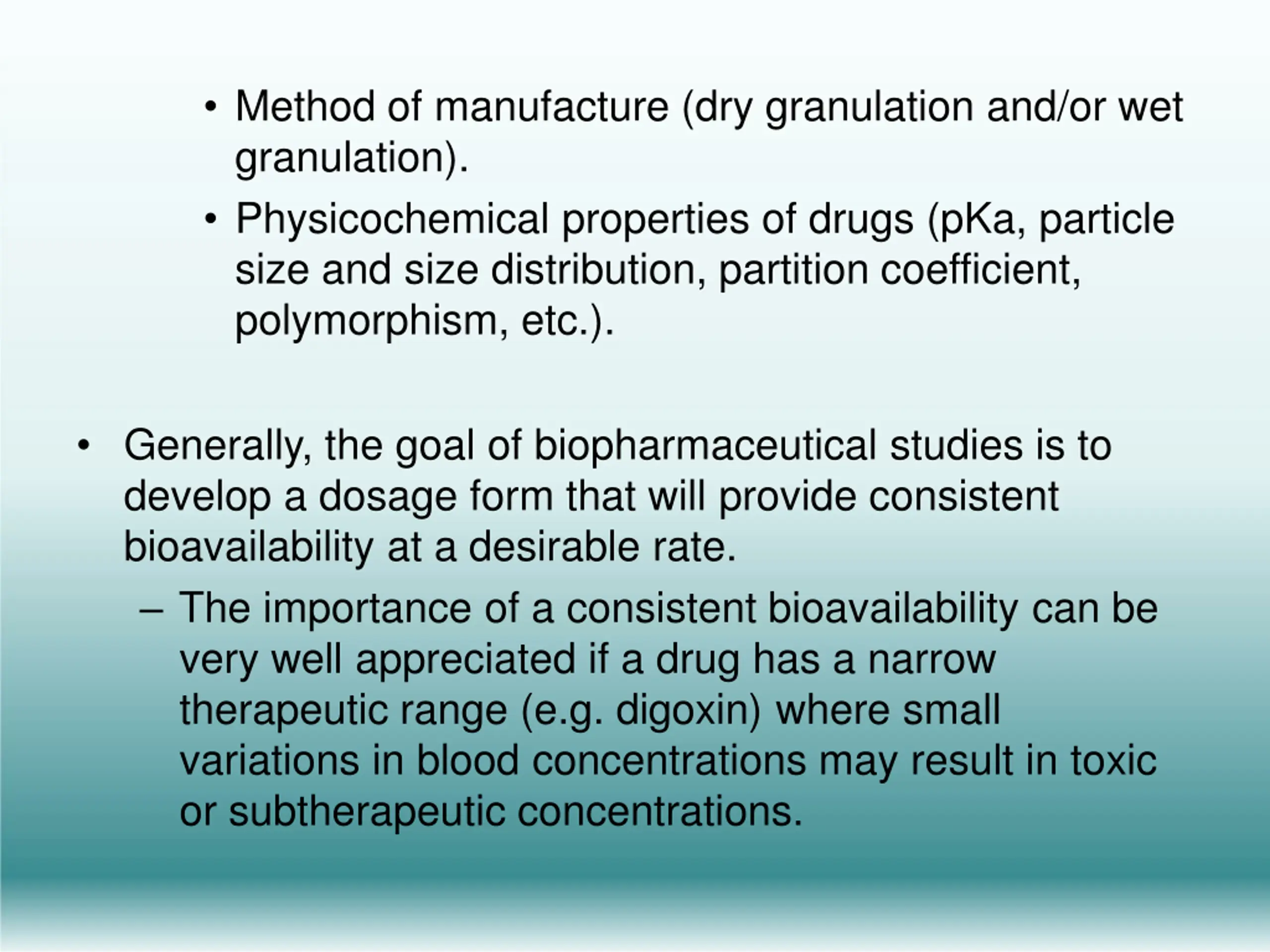 Method of manufacture (dry granulation and/or wet granulation). Physicochemical properties of drugs (pKa, particle size and size distribution, partition coefficient, polymorphism, etc.). Generally, the goal of biopharmaceutical studies is to develop a dosage form that will provide consistent bioavailability at a desirable rate. The importance of a consistent bioavailability can be very well appreciated if a drug has a narrow therapeutic range (e.g. digoxin) where small variations in blood concentrations may result in toxic or subtherapeutic concentrations.