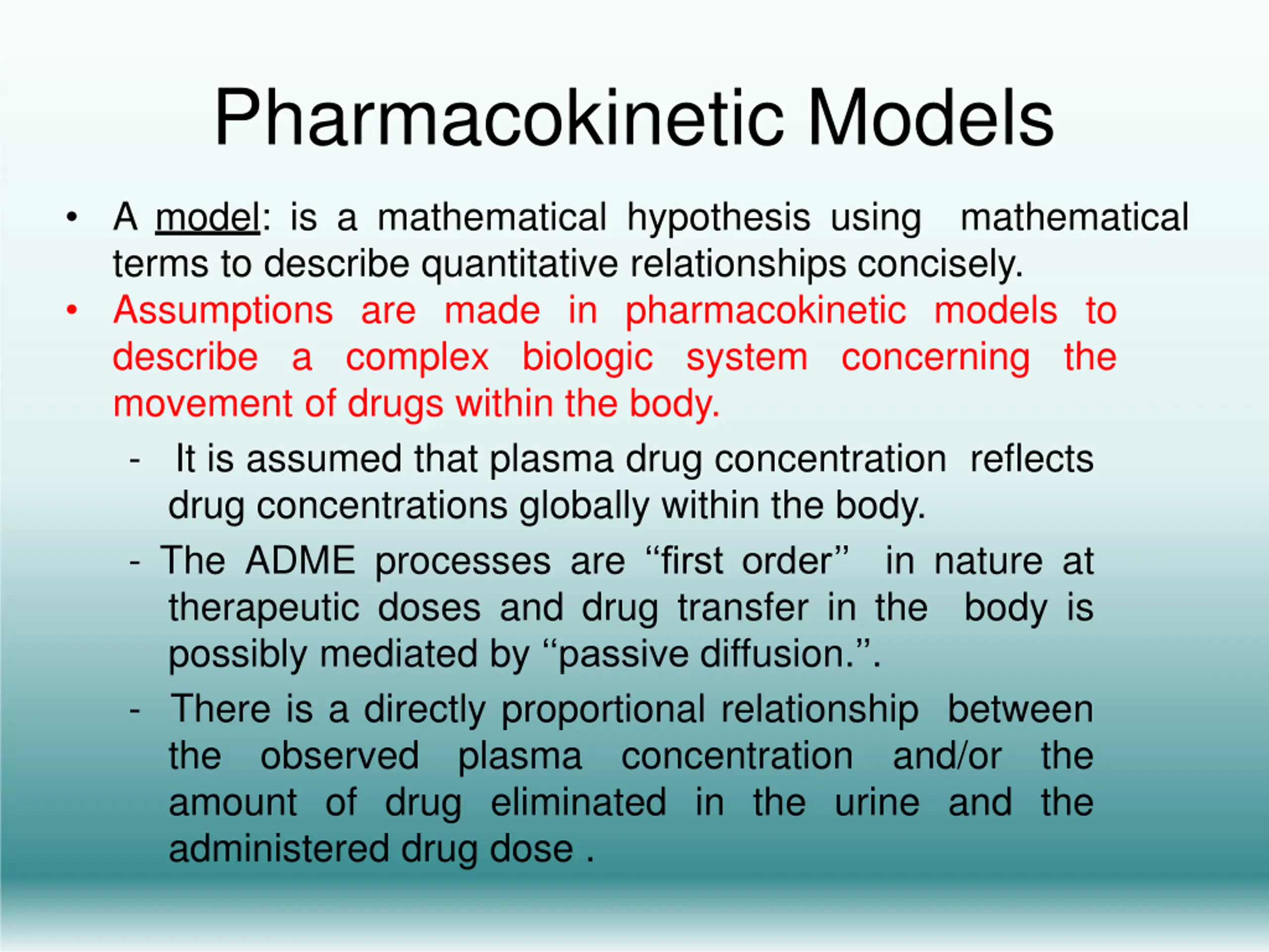 Pharmacokinetic Models A model: is a mathematical hypothesis using terms to describe quantitative relationships concisely. Assumptions are made in pharmacokinetic models to describe a complex biologic system concerning the movement of drugs within the body. - It is assumed that plasma drug concentration reflects drug concentrations globally within the body. - The ADME processes are firstorder in nature at therapeutic doses and drug transfer in the body is possibly mediated by passive diffusion. . - There is a directly proportional relationship between the observed plasma concentration and/or the amount of drug eliminated in the urine and the administered drug dose . mathematical