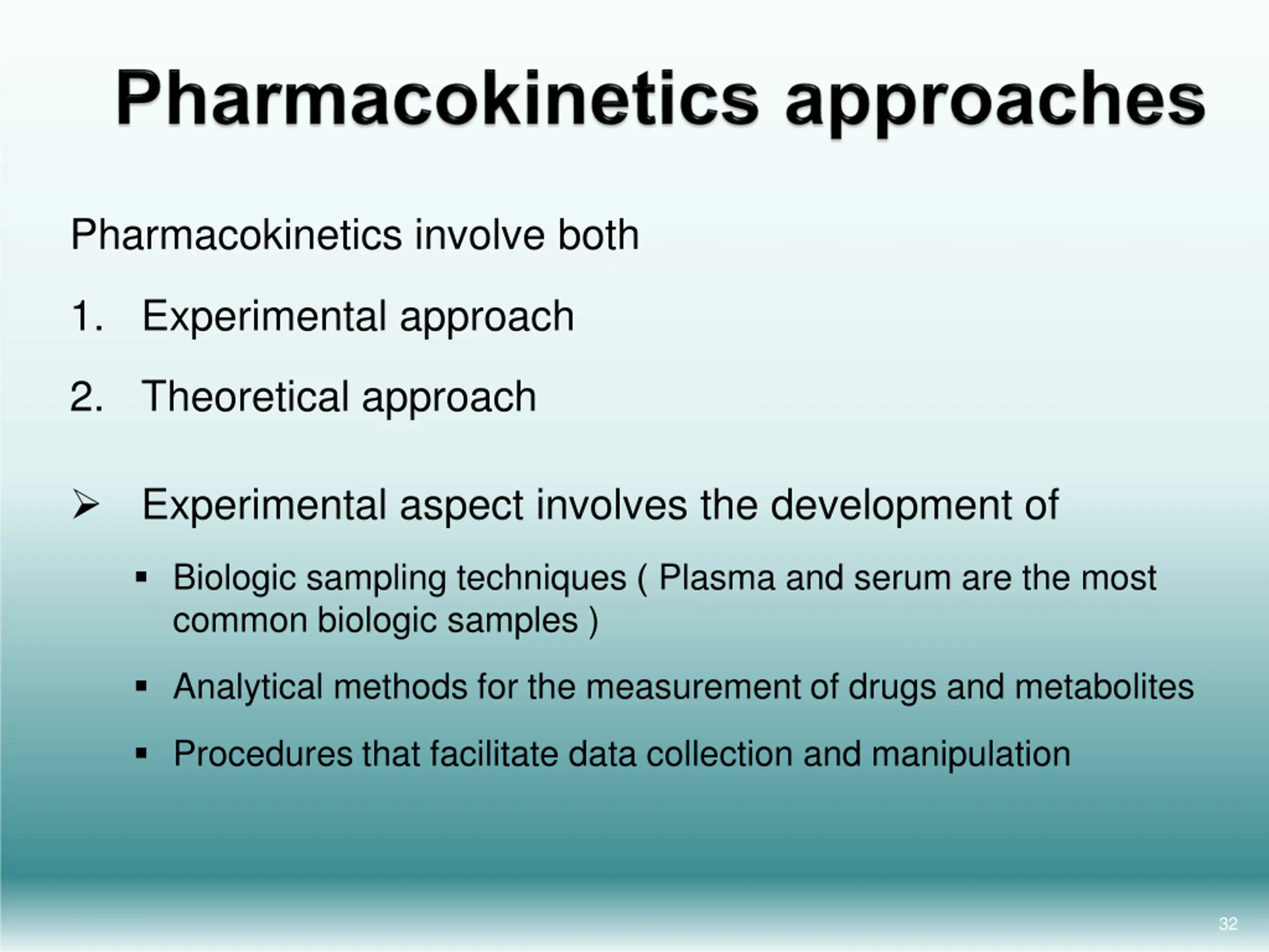 Pharmacokinetics involve both 1. Experimental approach 2. Theoretical approach Experimental aspect involves the development of Biologic sampling techniques ) Plasma and serum are the most common biologic samples ) Analytical methods for the measurement of drugs and metabolites Procedures that facilitate data collection and manipulation 32