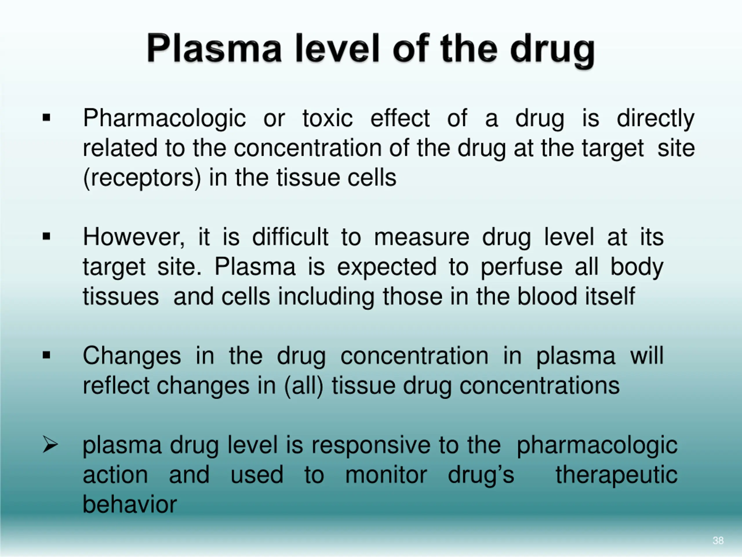 Pharmacologic or toxic effect of a drug is directly related to the concentration of the drug at the target site (receptors) in the tissue cells However, it is difficult to measure drug level at its target site. Plasma is expected to perfuse all body tissues and cells including those in the blood itself Changes in the drug concentration in plasma will reflect changes in (all) tissue drug concentrations plasma drug level is responsive to the pharmacologic action and used to monitor drug s behavior therapeutic 38