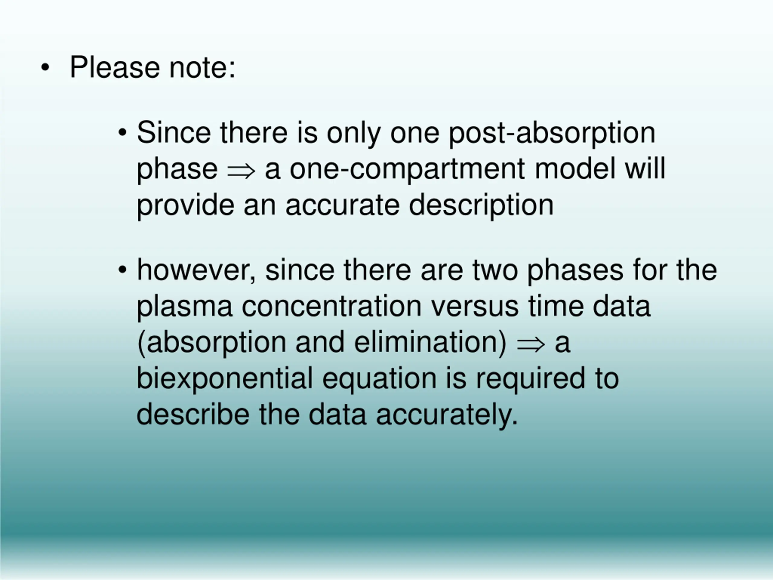 Please note: Since there is only one post-absorption phase a one-compartment model will provide an accurate description however, since there are two phases for the plasma concentration versus time data (absorption and elimination) a biexponential equation is required to describe the data accurately.