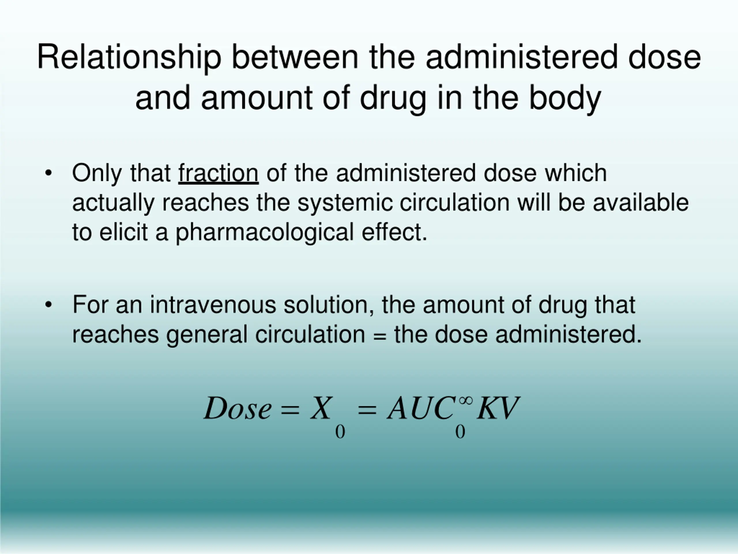 Relationship between the administered dose and amount of drug in the body Only that fraction of the administered dose which actually reaches the systemic circulation will be available to elicit a pharmacological effect. For an intravenous solution, the amount of drug that reaches general circulation = the dose administered. Dose = X = AUC KV 0 0
