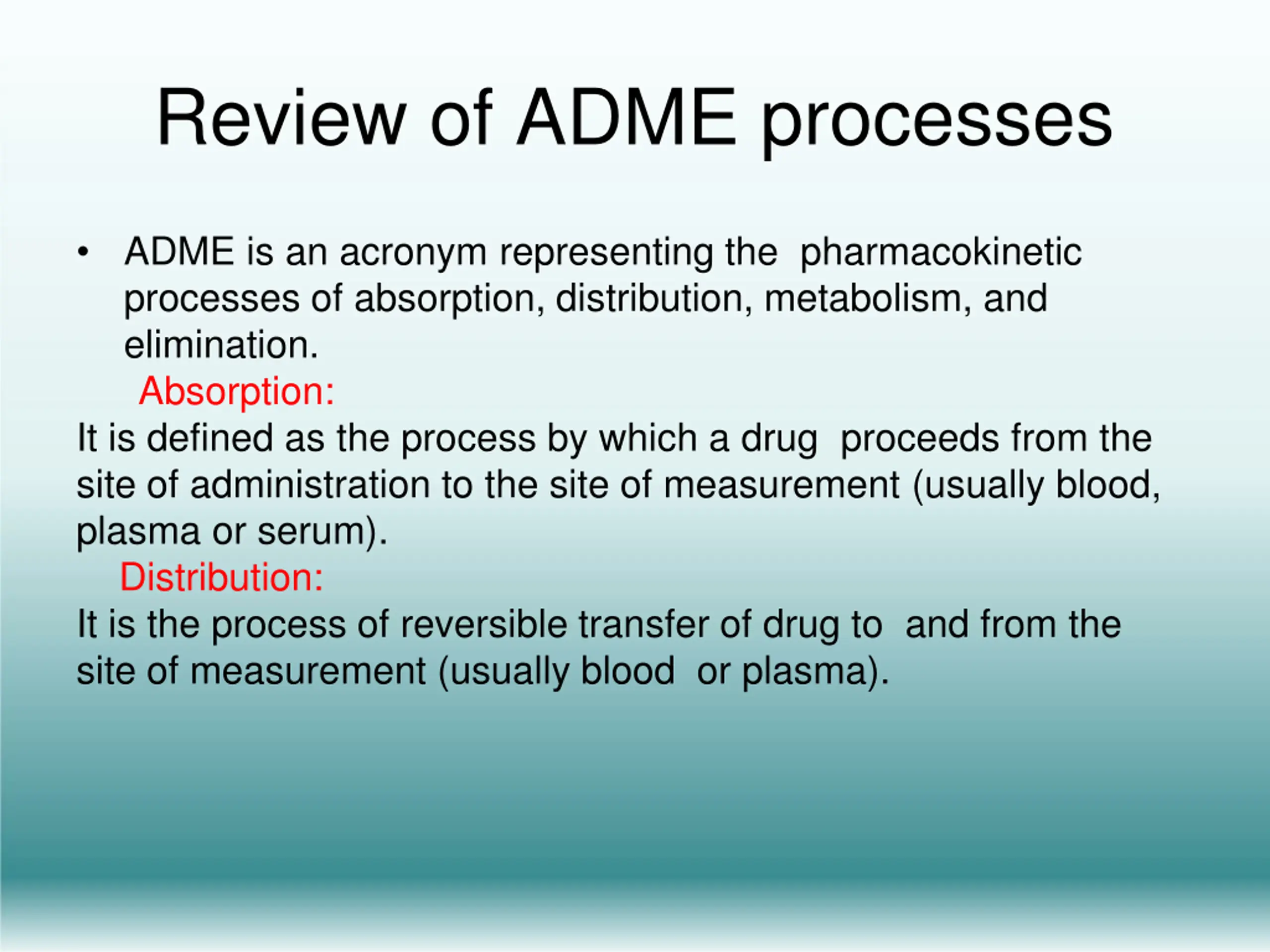 Review of ADME processes ADME is an acronym representing the pharmacokinetic processes of absorption, distribution, metabolism, and elimination. Absorption: It is defined as the process by which a drug proceeds from the site of administration to the site of measurement (usually blood, plasma or serum). Distribution: It is the process of reversible transfer of drug to and from the site of measurement (usually blood or plasma).