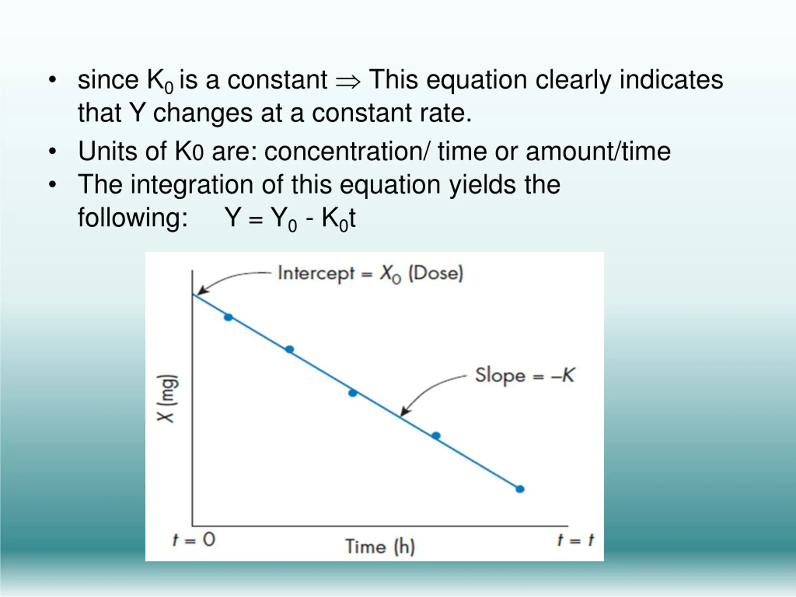since K0is a constant This equation clearly indicates that Y changes at a constant rate. Units of K0 are: concentration/ time or amount/time The integration of this equation yields the following: Y = Y0- K0t