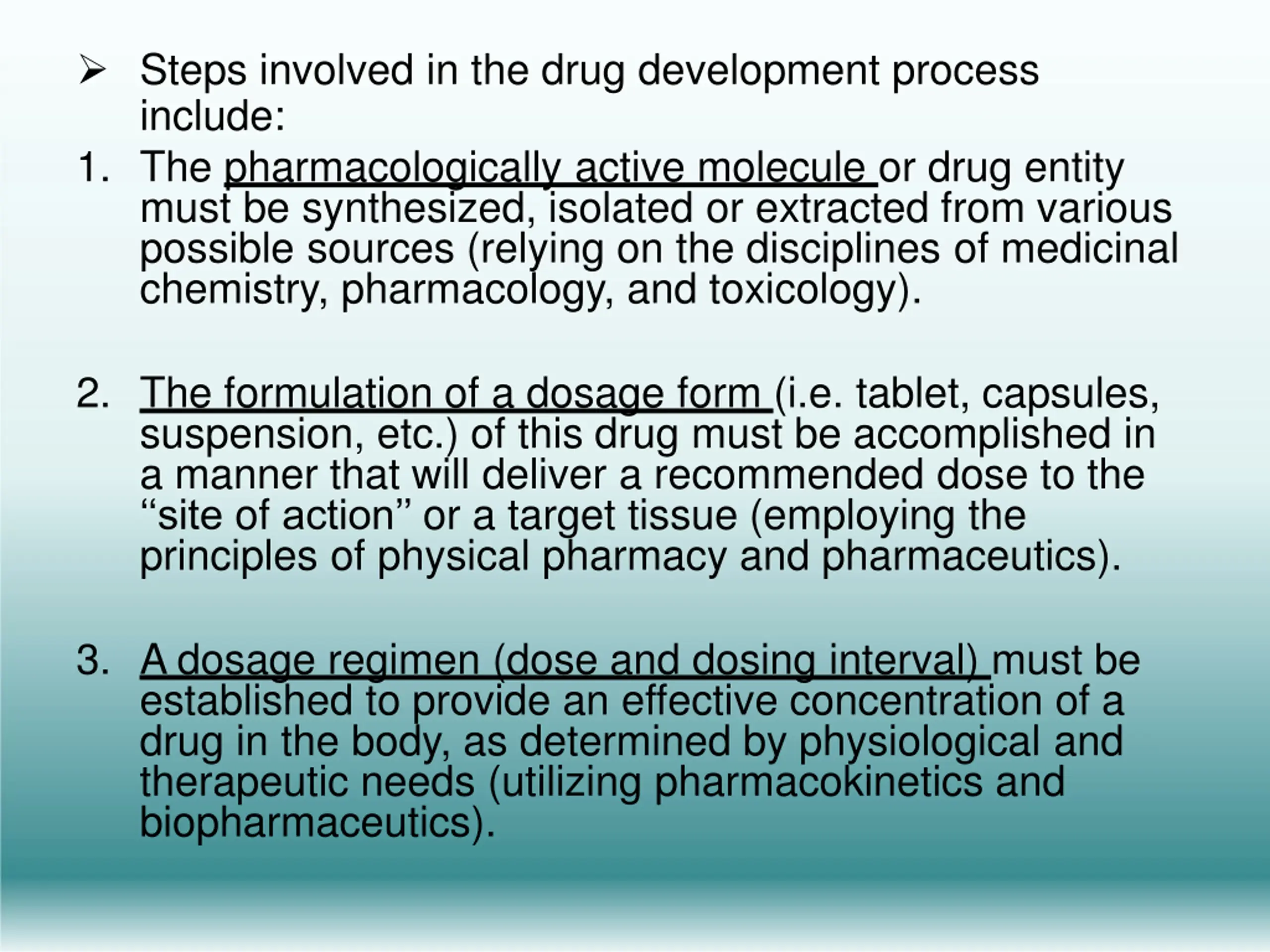 Steps involved in the drug development process include: 1. The pharmacologically active molecule or drug entity must be synthesized, isolated or extracted from various possible sources (relying on the disciplines of medicinal chemistry, pharmacology, and toxicology). 2. The formulation of a dosage form (i.e. tablet, capsules, suspension, etc.) of this drug must be accomplished in a manner that will deliver a recommended dose to the site of action or a target tissue (employing the principles of physical pharmacy and pharmaceutics). 3. A dosage regimen (dose and dosing interval) must be established to provide an effective concentration of a drug in the body, as determined by physiological and therapeutic needs (utilizing pharmacokinetics and biopharmaceutics).