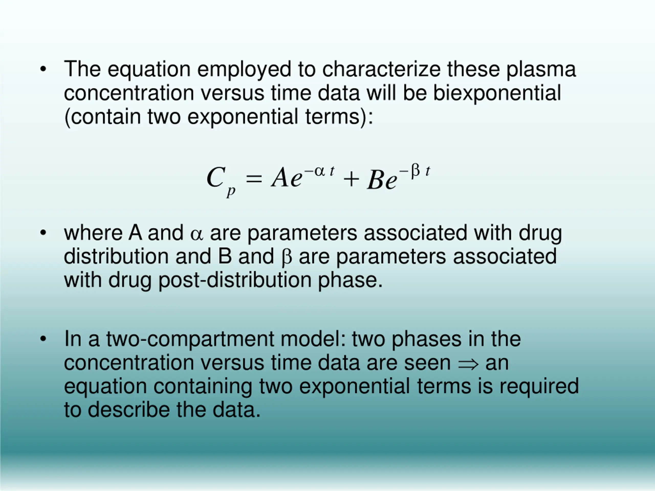 The equation employed to characterize these plasma concentration versus time data will be biexponential (contain two exponential terms): C = Ae t+ p t Be where A and are parameters associated with drug distribution and B and are parameters associated with drug post-distribution phase. In a two-compartment model: two phases in the concentration versus time data are seen an equation containing two exponential terms is required to describe the data.