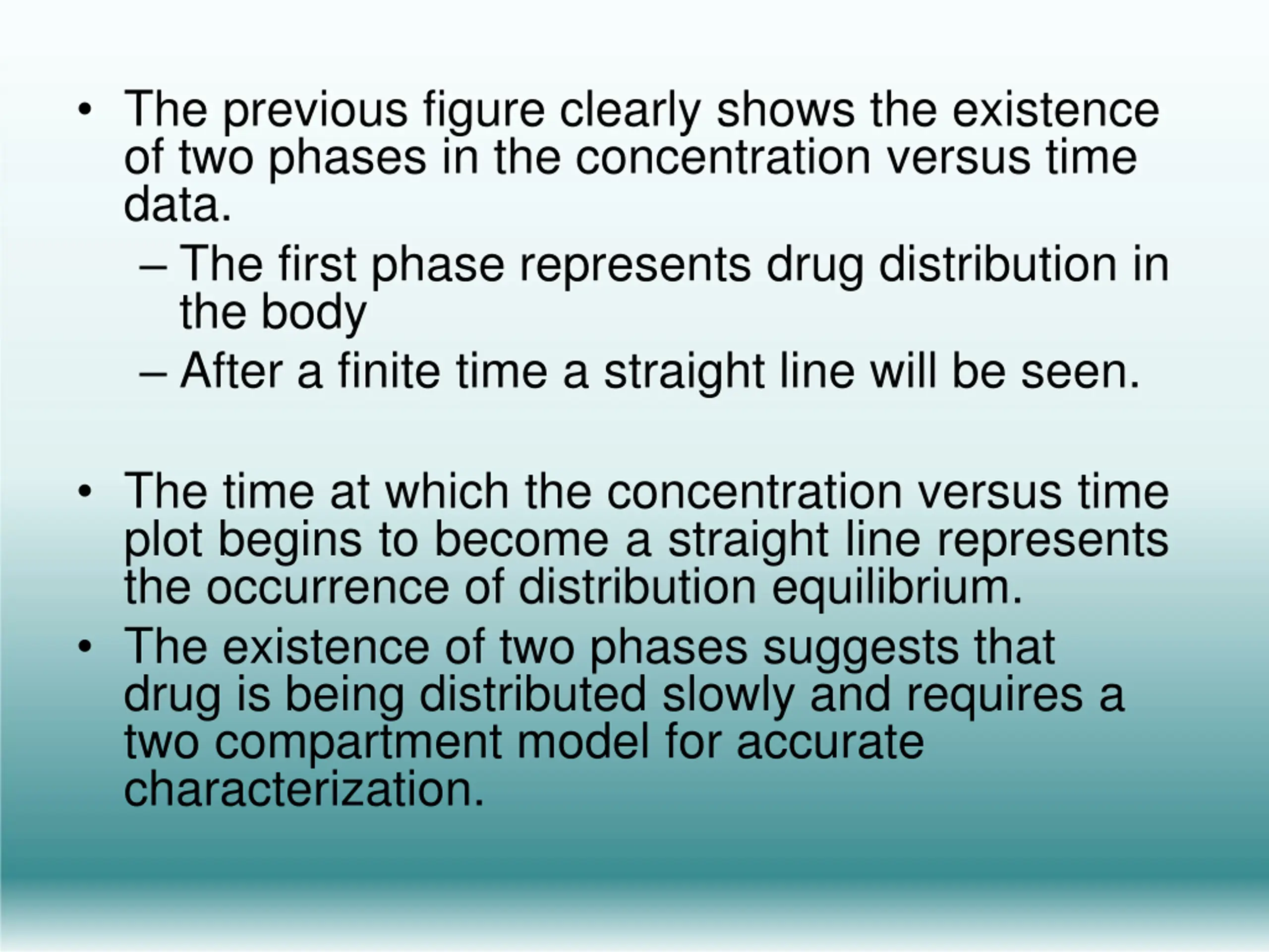 The previous figure clearly shows the existence of two phases in the concentration versus time data. The first phase represents drug distribution in the body After a finite time a straight line will be seen. The time at which the concentration versus time plot begins to become a straight line represents the occurrence of distribution equilibrium. The existence of two phases suggests that drug is being distributed slowly and requires a two compartment model for accurate characterization.