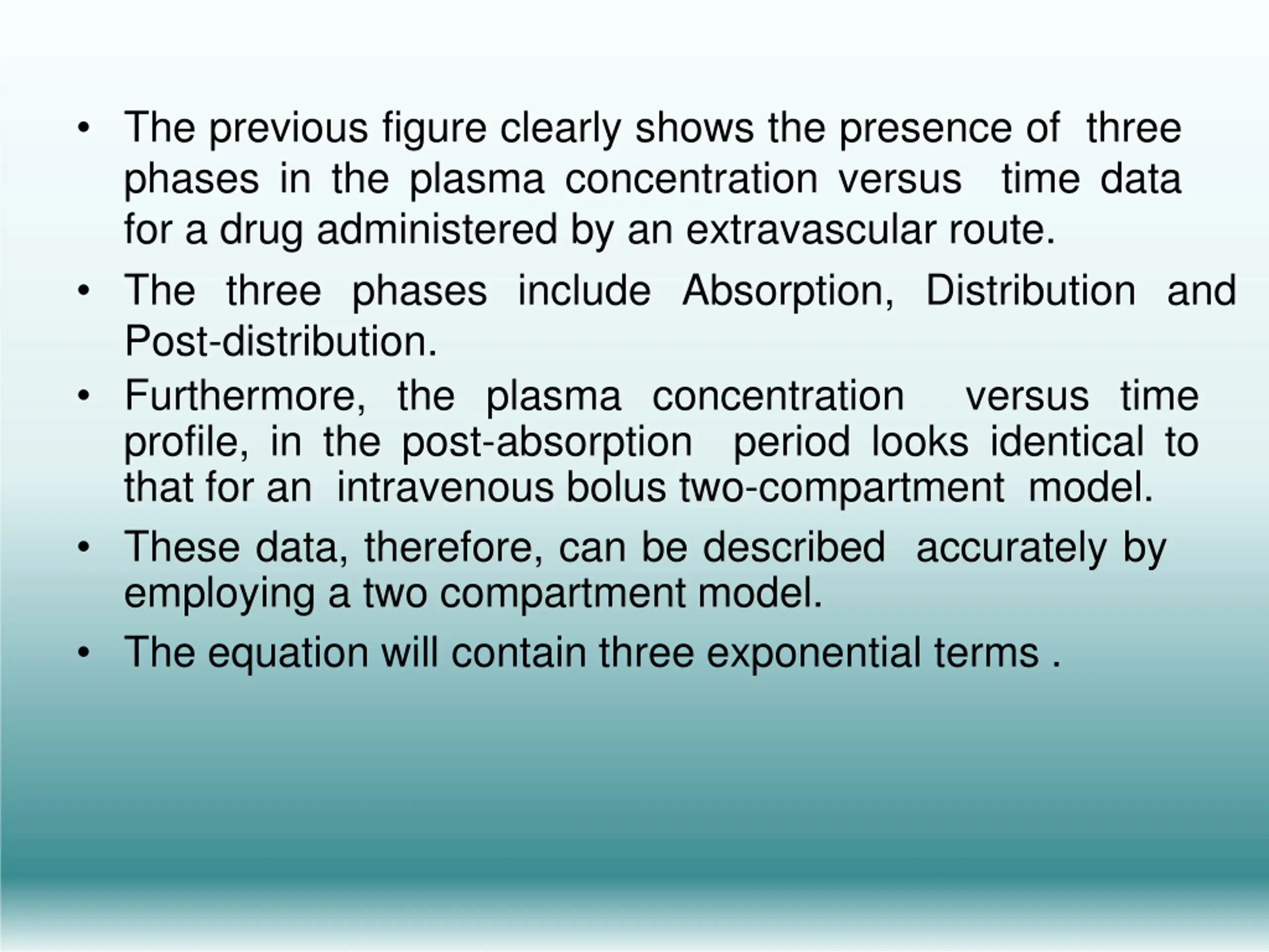 The previous figure clearly shows the presence of three phases in the plasma concentration versus for a drug administered by an extravascular route. The three phases include Absorption, Distribution and Post-distribution. Furthermore, the plasma concentration profile, in the post-absorption period looks identical to that for an intravenous bolus two-compartment model. These data, therefore, can be described accurately by employing a two compartment model. The equation will contain three exponential terms . time data versus time