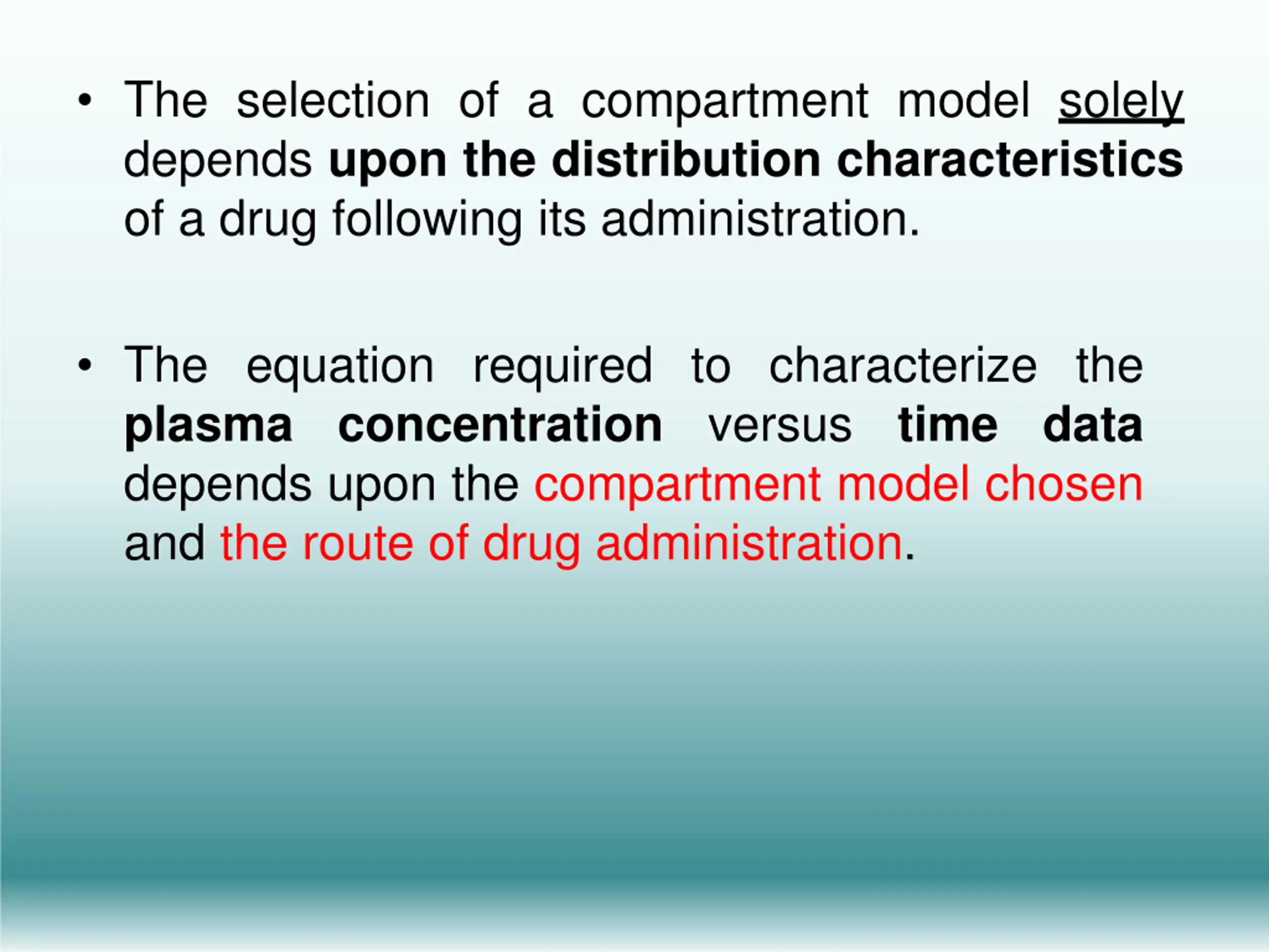 The selection of a compartment model solely depends upon the distribution characteristics of a drug following its administration. The equation required to characterize the plasma concentration versus time data depends upon the compartment model chosen and the route of drug administration.