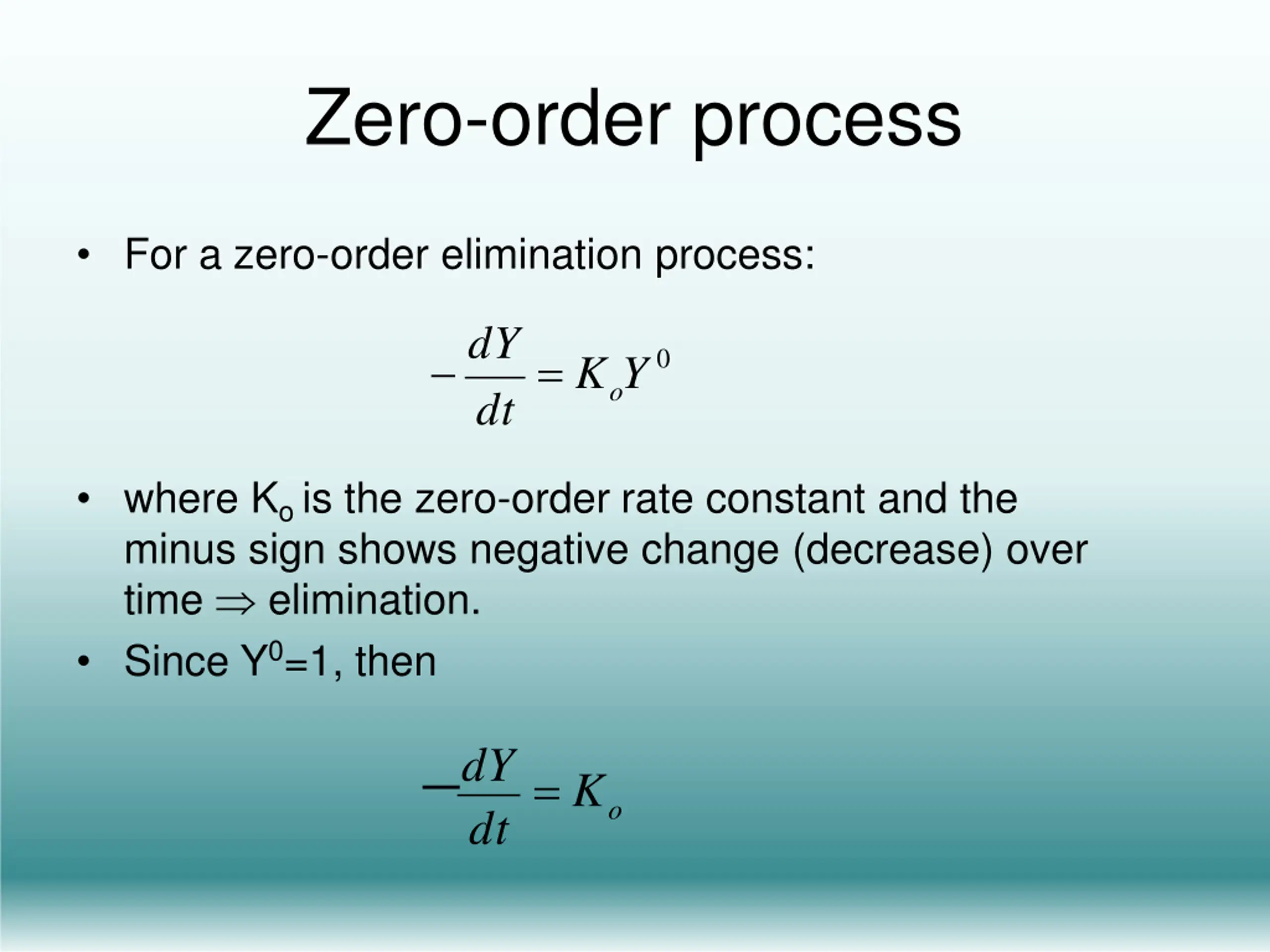 Zero-order process For a zero-order elimination process: dY = K Y 0 o dt where Kois the zero-order rate constant and the minus sign shows negative change (decrease) over time elimination. Since Y0=1, then dY= K o dt