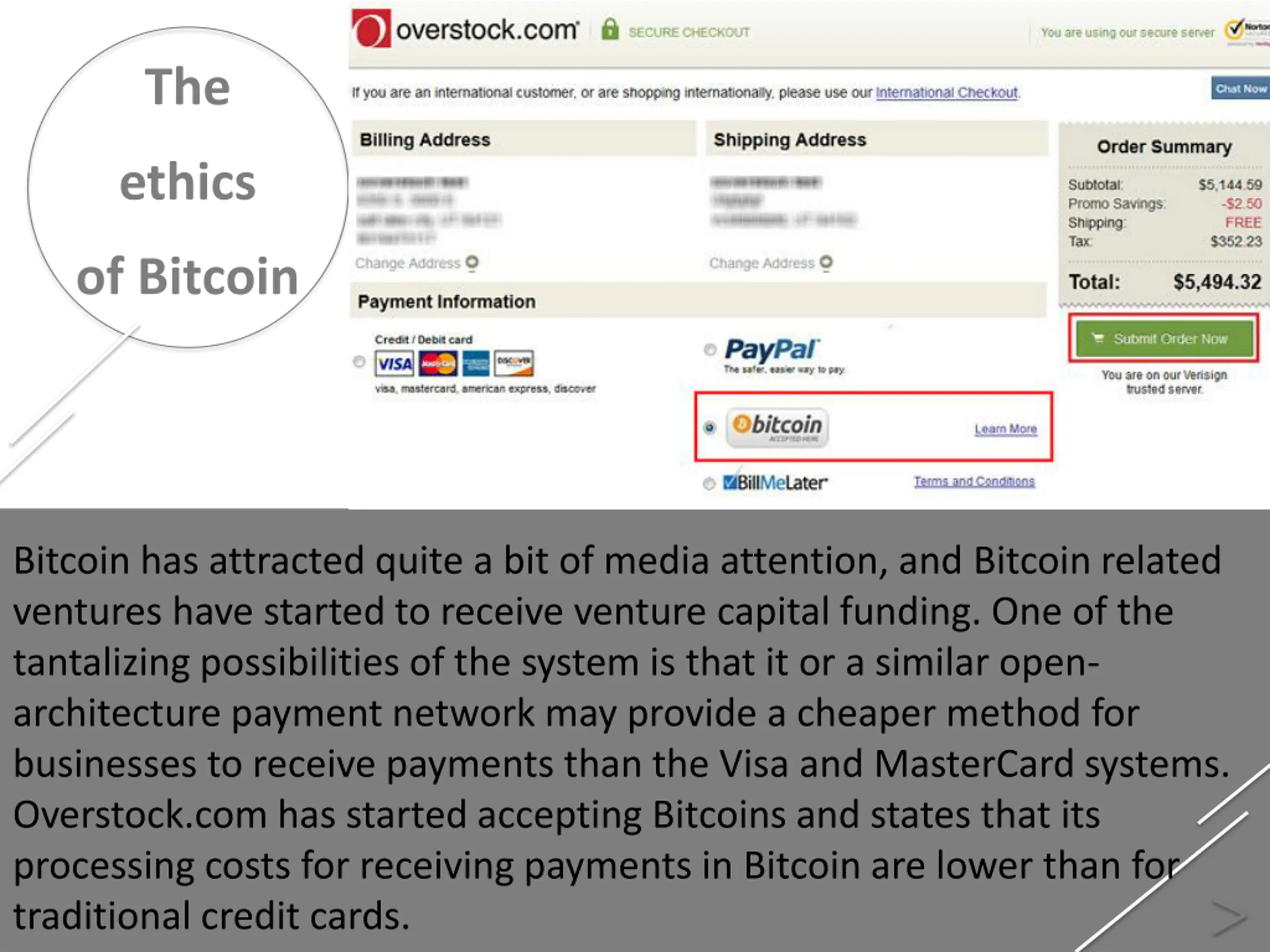 The ethics of Bitcoin Bitcoin has attracted quite a bit of media attention, and Bitcoin related ventures have started to receive venture capital funding. One of the tantalizing possibilities of the system is that it or a similar open- architecture payment network may provide a cheaper method for businesses to receive payments than the Visa and MasterCard systems. Overstock.com has started accepting Bitcoins and states that its processing costs for receiving payments in Bitcoin are lower than for traditional credit cards.