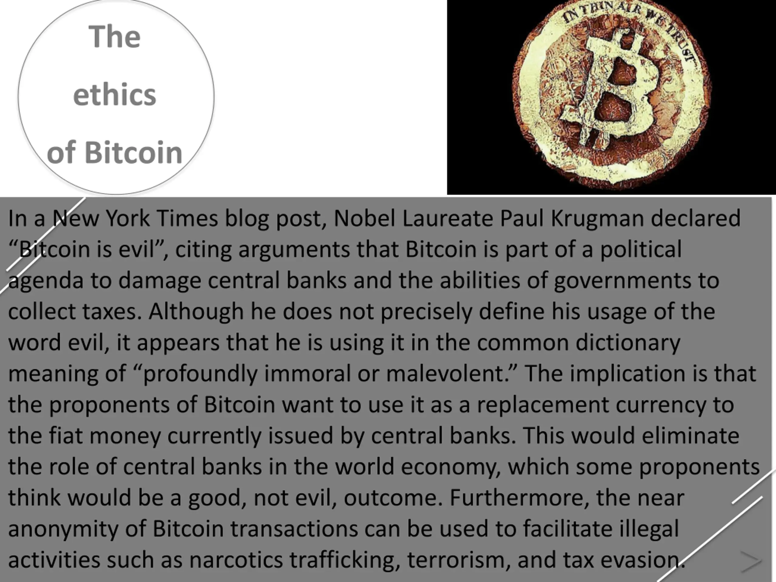 The ethics of Bitcoin In a New York Times blog post, Nobel Laureate Paul Krugman declared Bitcoin is evil , citing arguments that Bitcoin is part of a political agenda to damage central banks and the abilities of governments to collect taxes. Although he does not precisely define his usage of the word evil, it appears that he is using it in the common dictionary meaning of profoundly immoral or malevolent. The implication is that the proponents of Bitcoin want to use it as a replacement currency to the fiat money currently issued by central banks. This would eliminate the role of central banks in the world economy, which some proponents think would be a good, not evil, outcome. Furthermore, the near anonymity of Bitcoin transactions can be used to facilitate illegal activities such as narcotics trafficking, terrorism, and tax evasion.
