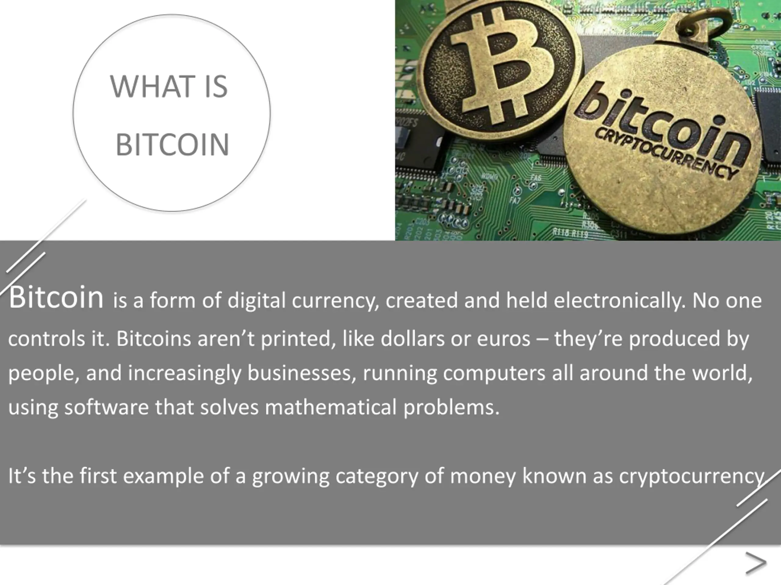 WHAT IS BITCOIN Bitcoin is a form of digital currency, created and held electronically. No one controls it. Bitcoins aren t printed, like dollars or euros they re produced by people, and increasingly businesses, running computers all around the world, using software that solves mathematical problems. It s the first example of a growing category of money known as cryptocurrency.