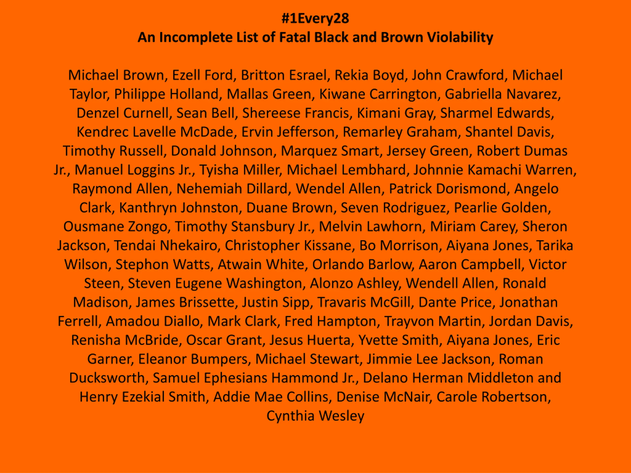 #1Every28 An Incomplete List of Fatal Black and Brown Violability Michael Brown, Ezell Ford, Britton Esrael, Rekia Boyd, John Crawford, Michael Taylor, Philippe Holland, Mallas Green, Kiwane Carrington, Gabriella Navarez, Denzel Curnell, Sean Bell, Shereese Francis, Kimani Gray, Sharmel Edwards, Kendrec Lavelle McDade, Ervin Jefferson, Remarley Graham, Shantel Davis, Timothy Russell, Donald Johnson, Marquez Smart, Jersey Green, Robert Dumas Jr., Manuel Loggins Jr., Tyisha Miller, Michael Lembhard, Johnnie Kamachi Warren, Raymond Allen, Nehemiah Dillard, Wendel Allen, Patrick Dorismond, Angelo Clark, Kanthryn Johnston, Duane Brown, Seven Rodriguez, Pearlie Golden, Ousmane Zongo, Timothy Stansbury Jr., Melvin Lawhorn, Miriam Carey, Sheron Jackson, Tendai Nhekairo, Christopher Kissane, Bo Morrison, Aiyana Jones, Tarika Wilson, Stephon Watts, Atwain White, Orlando Barlow, Aaron Campbell, Victor Steen, Steven Eugene Washington, Alonzo Ashley, Wendell Allen, Ronald Madison, James Brissette, Justin Sipp, Travaris McGill, Dante Price, Jonathan Ferrell, Amadou Diallo, Mark Clark, Fred Hampton, Trayvon Martin, Jordan Davis, Renisha McBride, Oscar Grant, Jesus Huerta, Yvette Smith, Aiyana Jones, Eric Garner, Eleanor Bumpers, Michael Stewart, Jimmie Lee Jackson, Roman Ducksworth, Samuel Ephesians Hammond Jr., Delano Herman Middleton and Henry Ezekial Smith, Addie Mae Collins, Denise McNair, Carole Robertson, Cynthia Wesley