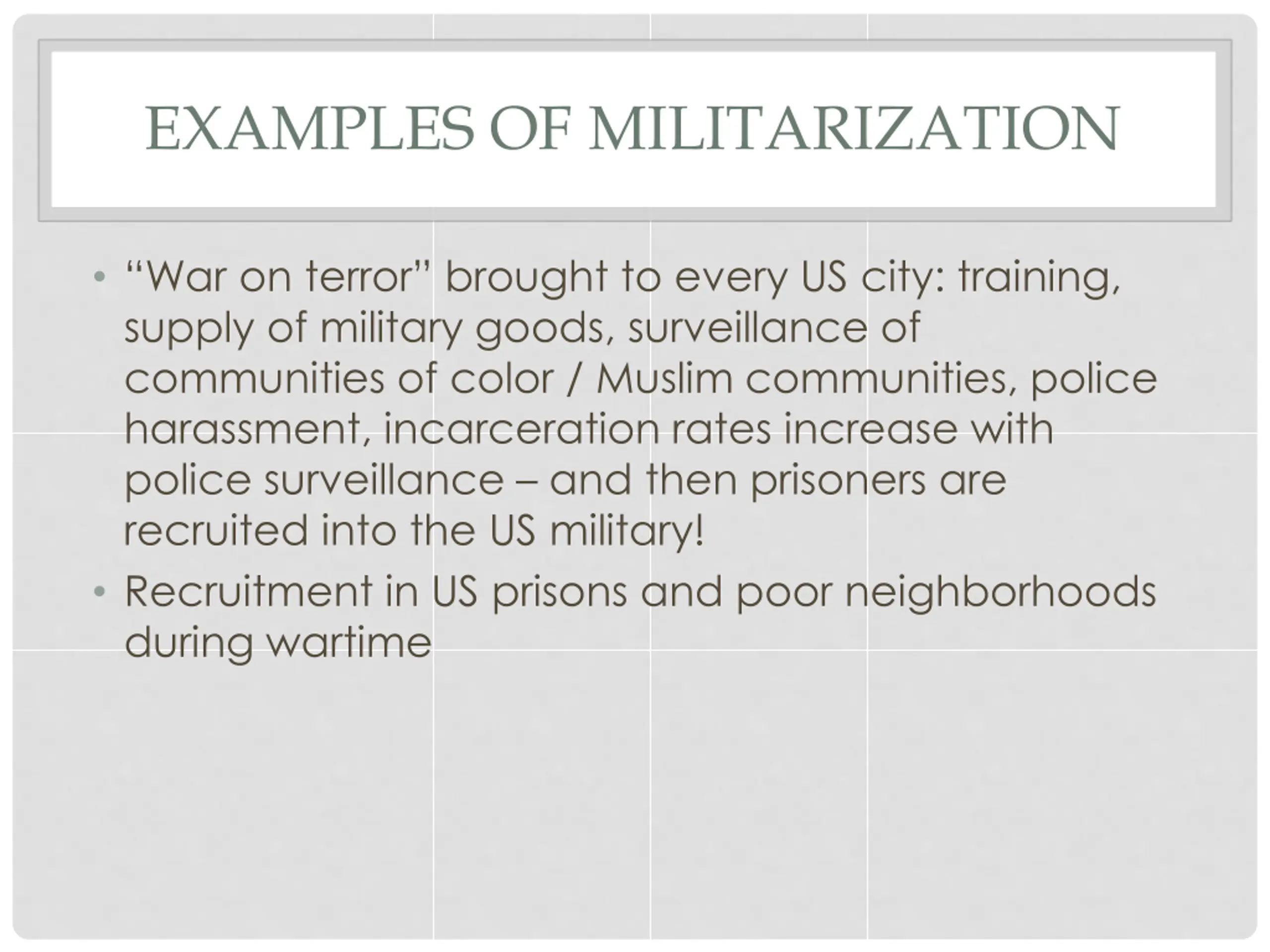EXAMPLES OF MILITARIZATION War on terror brought to every US city: training, supply of military goods, surveillance of communities of color / Muslim communities, police harassment, incarceration rates increase with police surveillance and then prisoners are recruited into the US military! Recruitment in US prisons and poor neighborhoods during wartime