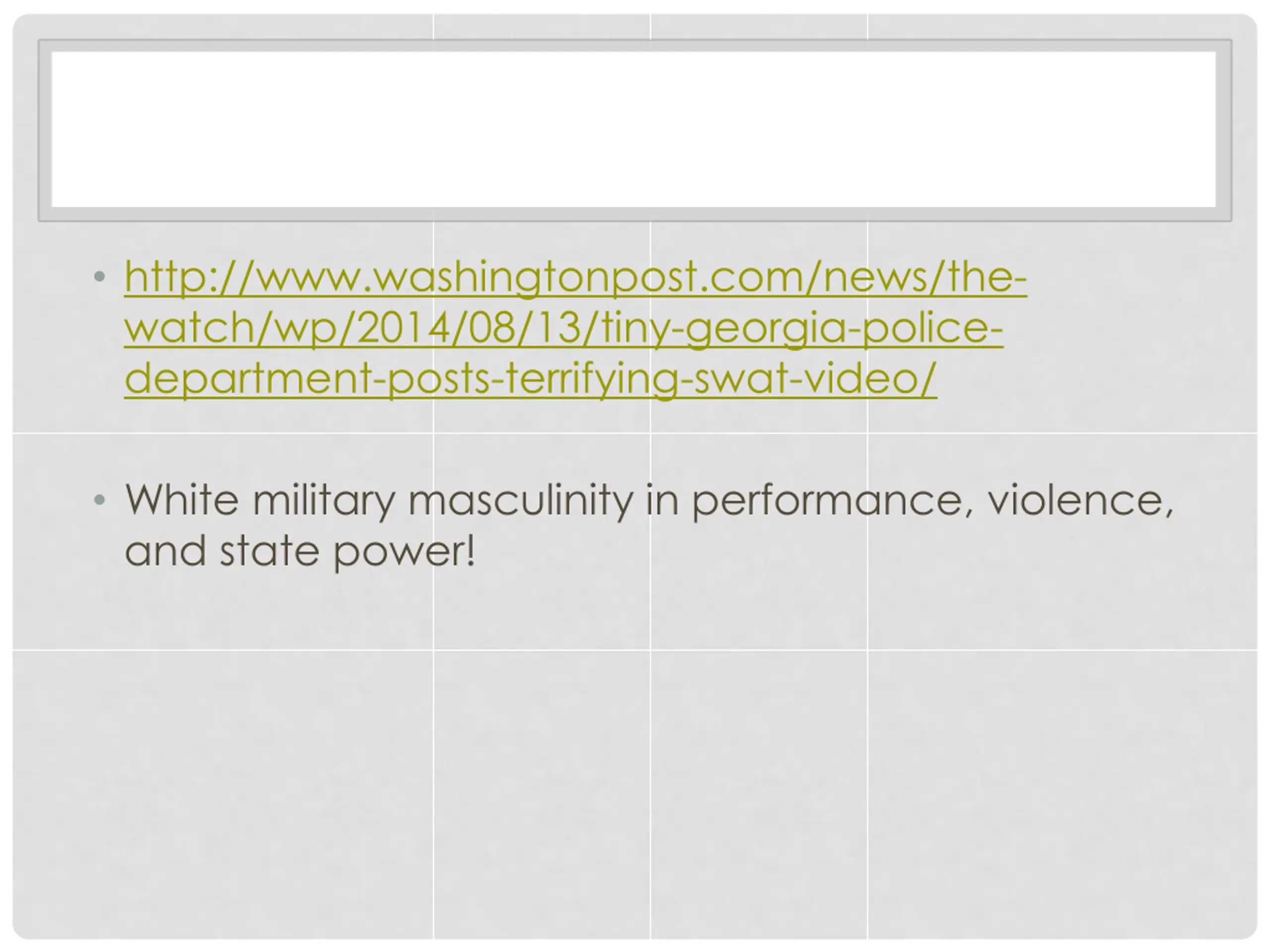 http://www.washingtonpost.com/news/the- watch/wp/2014/08/13/tiny-georgia-police- department-posts-terrifying-swat-video/ White military masculinity in performance, violence, and state power!