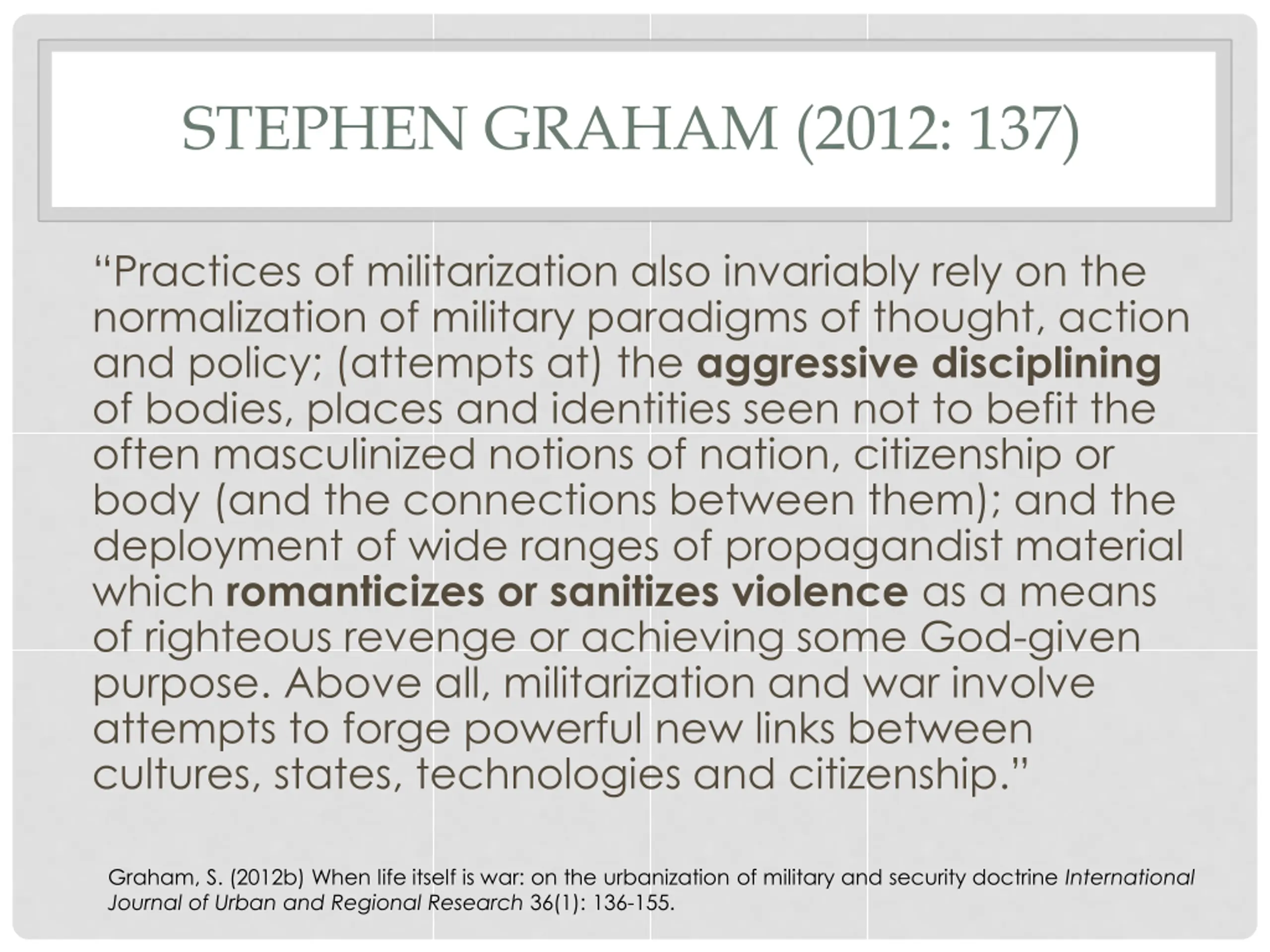 STEPHEN GRAHAM (2012: 137) Practices of militarization also invariably rely on the normalization of military paradigms of thought, action and policy; (attempts at) the aggressive disciplining of bodies, places and identities seen not to befit the often masculinized notions of nation, citizenship or body (and the connections between them); and the deployment of wide ranges of propagandist material which romanticizes or sanitizes violence as a means of righteous revenge or achieving some God-given purpose. Above all, militarization and war involve attempts to forge powerful new links between cultures, states, technologies and citizenship. Graham, S. (2012b) When life itself is war: on the urbanization of military and security doctrine International Journal of Urban and Regional Research 36(1): 136-155.