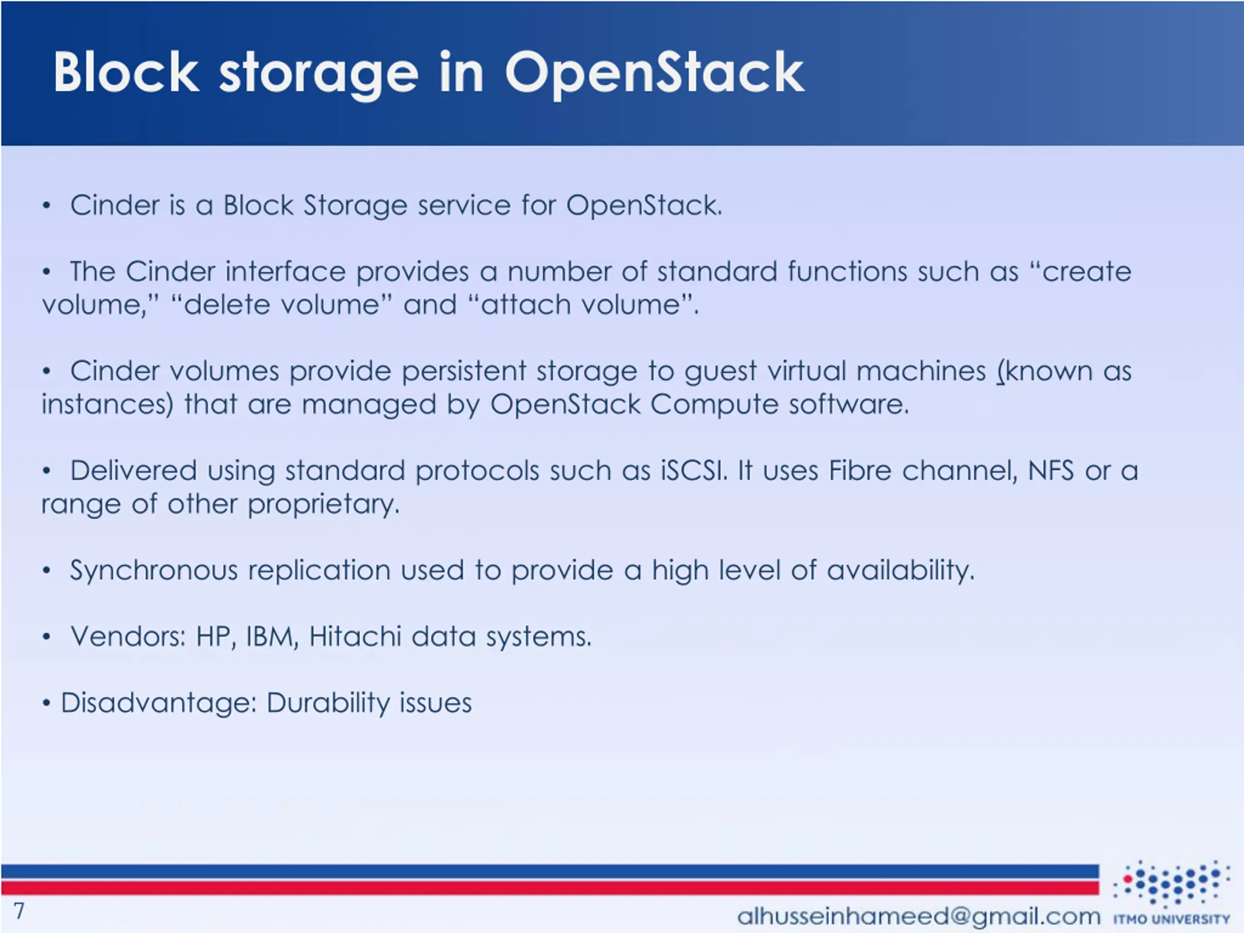 Block storage in OpenStack Cinder is a Block Storage service for OpenStack. The Cinder interface provides a number of standard functions such as create volume, delete volume and attach volume . Cinder volumes provide persistent storage to guest virtual machines (known as instances) that are managed by OpenStack Compute software. Delivered using standard protocols such as iSCSI. It uses Fibre channel, NFS or a range of other proprietary. Synchronous replication used to provide a high level of availability. Vendors: HP, IBM, Hitachi data systems. Disadvantage: Durability issues 7