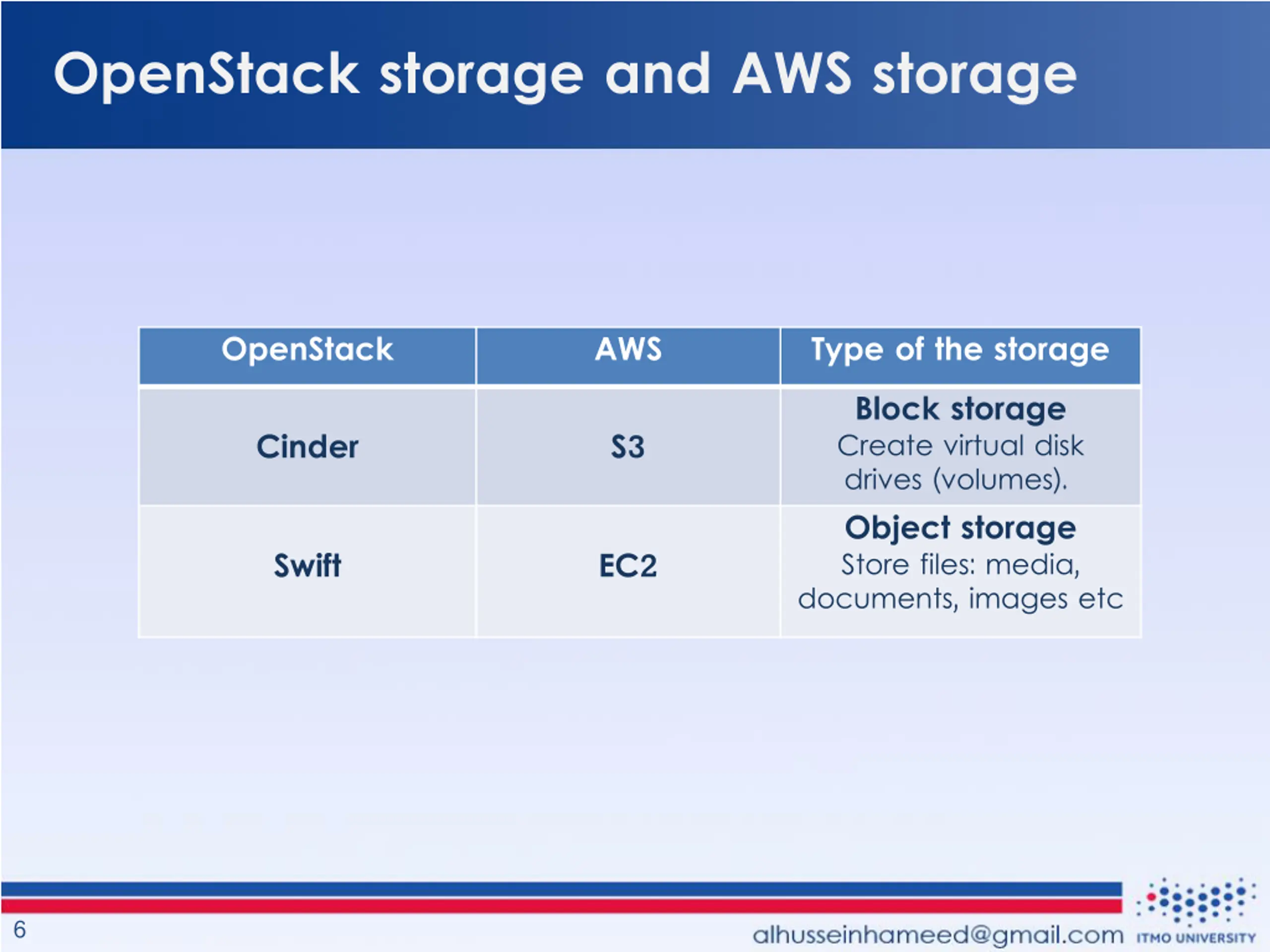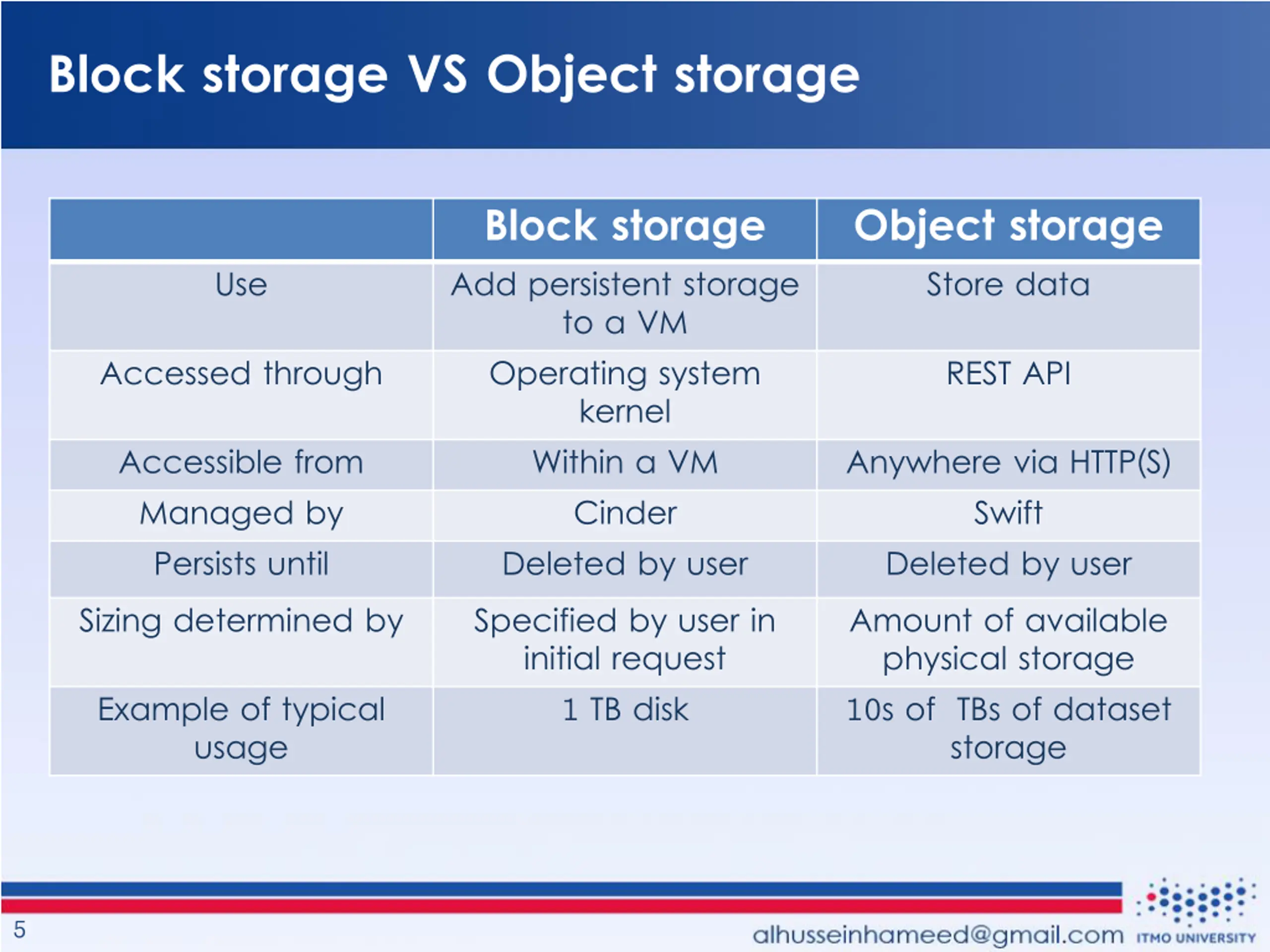 Block and Object storages Block storage Block storage is more like the hard drive in the computer in use and function and is typically used to provide virtual machines with an attached storage volume (virtual hard drive) Snapshots and backups of virtual servers. Good examples for block storage use cases are structured database storage, random read/write loads, and virtual machine file system (VMFS) volumes. Object storage Static Web content, data backups and archival images, and multimedia (videos, pictures, or music) files are best stored as objects. It has its own API and support other APIs as well. Every object contains three things: 1- The data itself, photo, document, etc. 2- An expandable amount of metadata. Defined by whoever creates the object storage. 3- A globally unique identifier. An address given to the object in order for the object to be found over a distributed system. 3