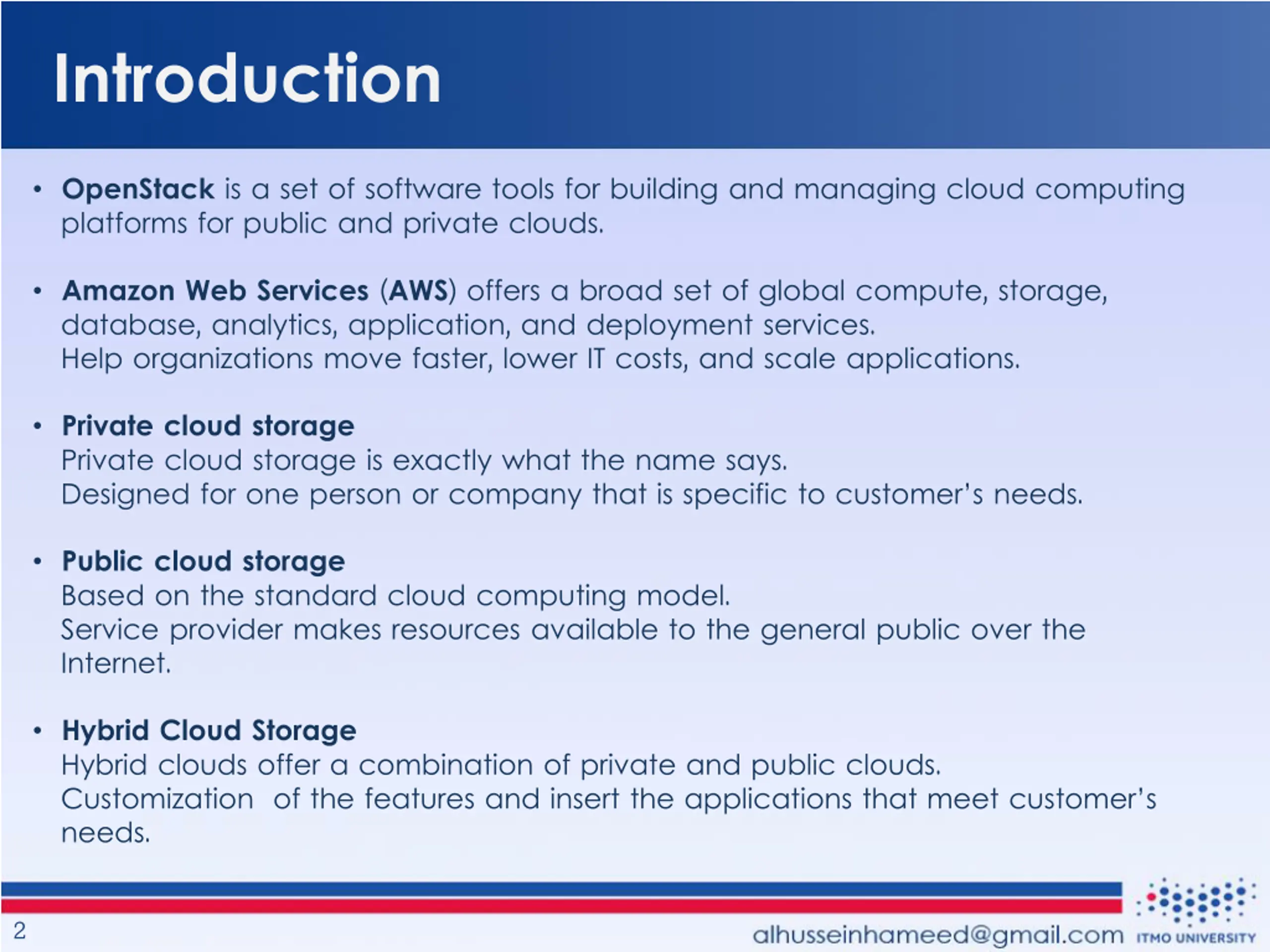 Introduction OpenStack is a set of software tools for building and managing cloud computing platforms for public and private clouds. Amazon Web Services (AWS) offers a broad set of global compute, storage, database, analytics, application, and deployment services. Help organizations move faster, lower IT costs, and scale applications. Private cloud storage Private cloud storage is exactly what the name says. Designed for one person or company that is specific to customer s needs. Public cloud storage Based on the standard cloud computing model. Service provider makes resources available to the general public over the Internet. Hybrid Cloud Storage Hybrid clouds offer a combination of private and public clouds. Customization of the features and insert the applications that meet customer s needs. 2