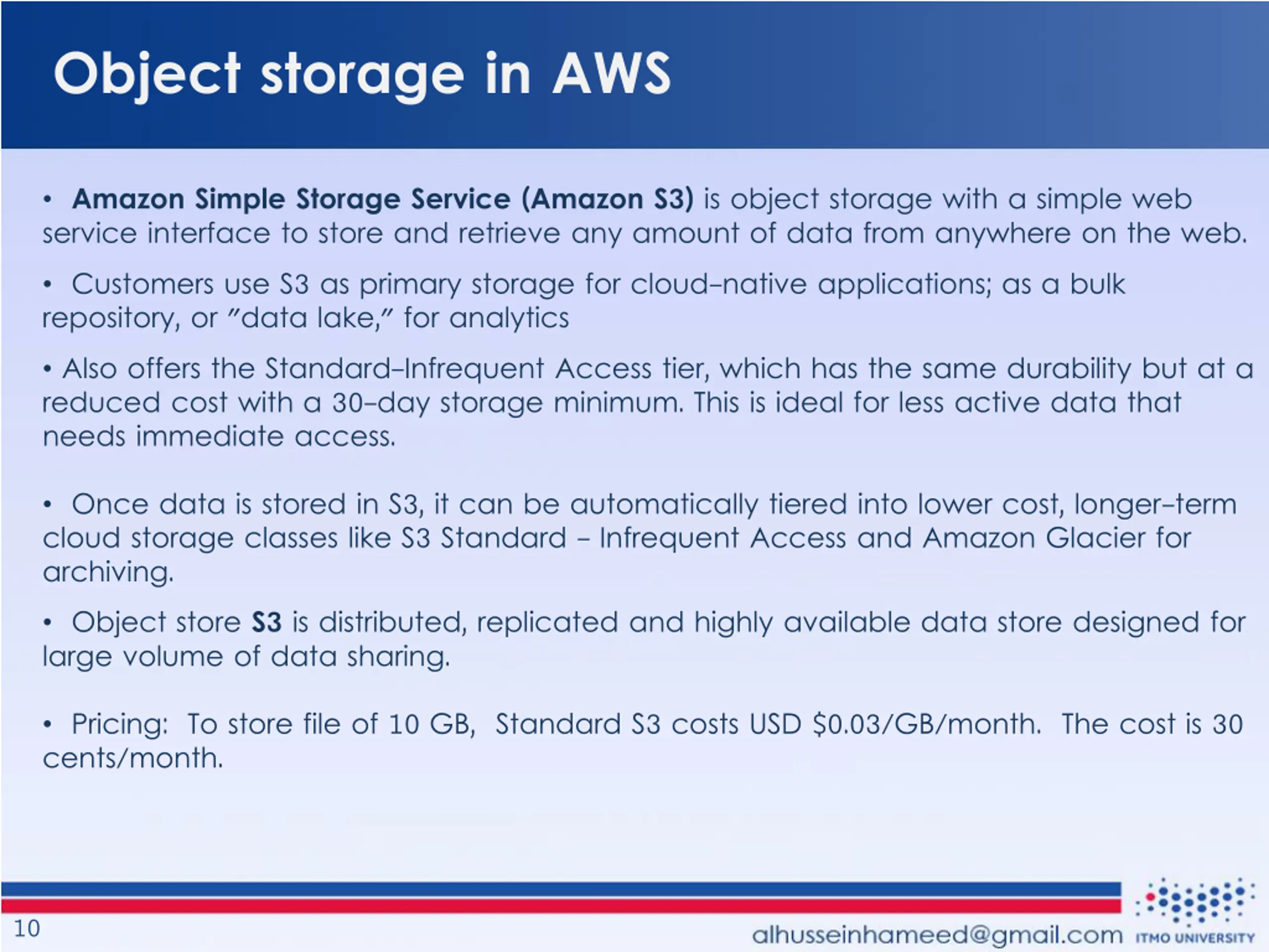 Object storage in AWS Amazon Simple Storage Service (Amazon S3) is object storage with a simple web service interface to store and retrieve any amount of data from anywhere on the web. Customers use S3 as primary storage for cloud-native applications; as a bulk repository, or "data lake," for analytics Also offers the Standard-Infrequent Access tier, which has the same durability but at a reduced cost with a 30-day storage minimum. This is ideal for less active data that needs immediate access. Once data is stored in S3, it can be automatically tiered into lower cost, longer-term cloud storage classes like S3 Standard - Infrequent Access and Amazon Glacier for archiving. Object store S3 is distributed, replicated and highly available data store designed for large volume of data sharing. Pricing: To store file of 10 GB, Standard S3 costs USD $0.03/GB/month. The cost is 30 cents/month. 10