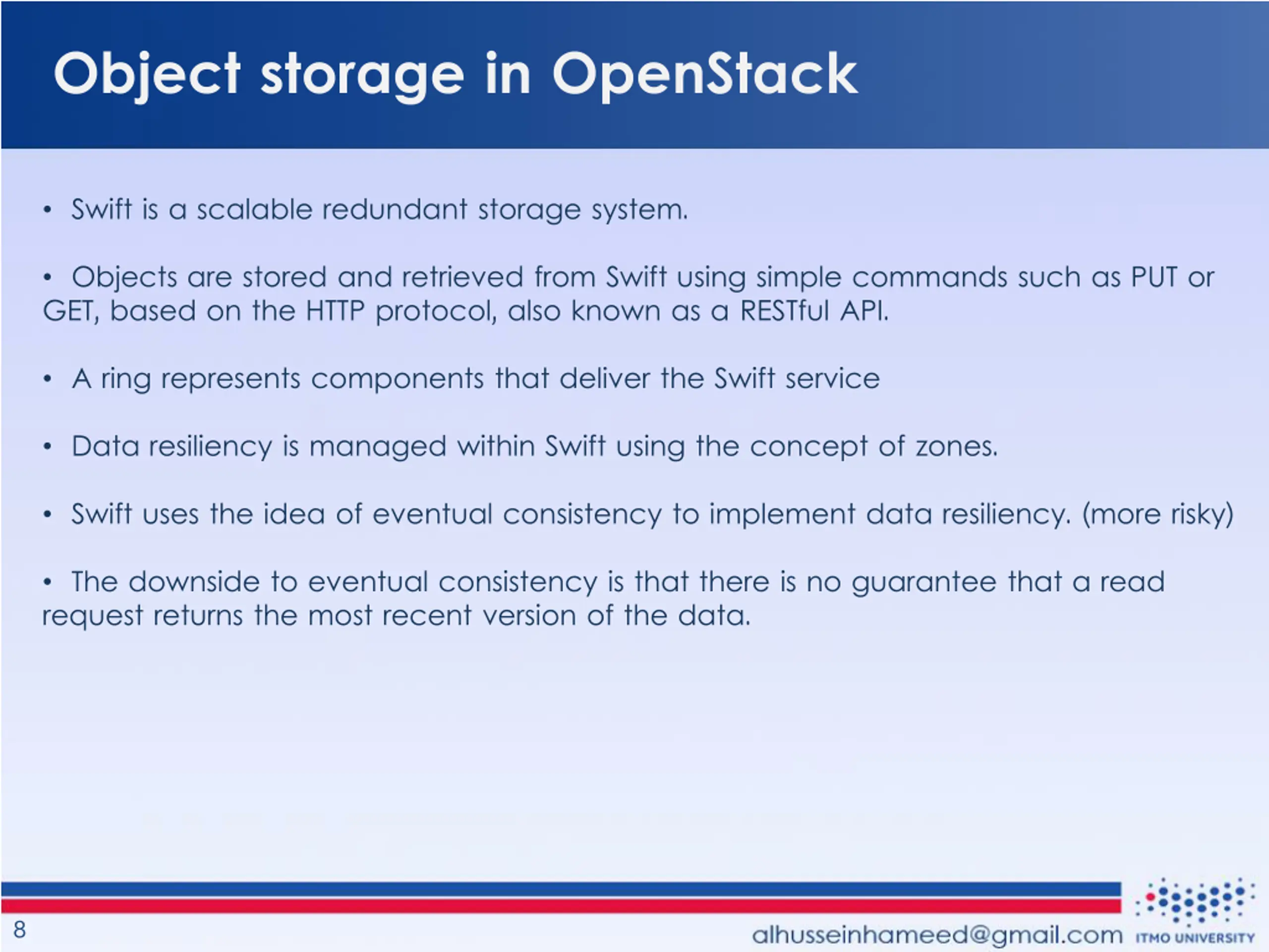Object storage in OpenStack Swift is a scalable redundant storage system. Objects are stored and retrieved from Swift using simple commands such as PUT or GET, based on the HTTP protocol, also known as a RESTful API. A ring represents components that deliver the Swift service Data resiliency is managed within Swift using the concept of zones. Swift uses the idea of eventual consistency to implement data resiliency. (more risky) The downside to eventual consistency is that there is no guarantee that a read request returns the most recent version of the data. 8