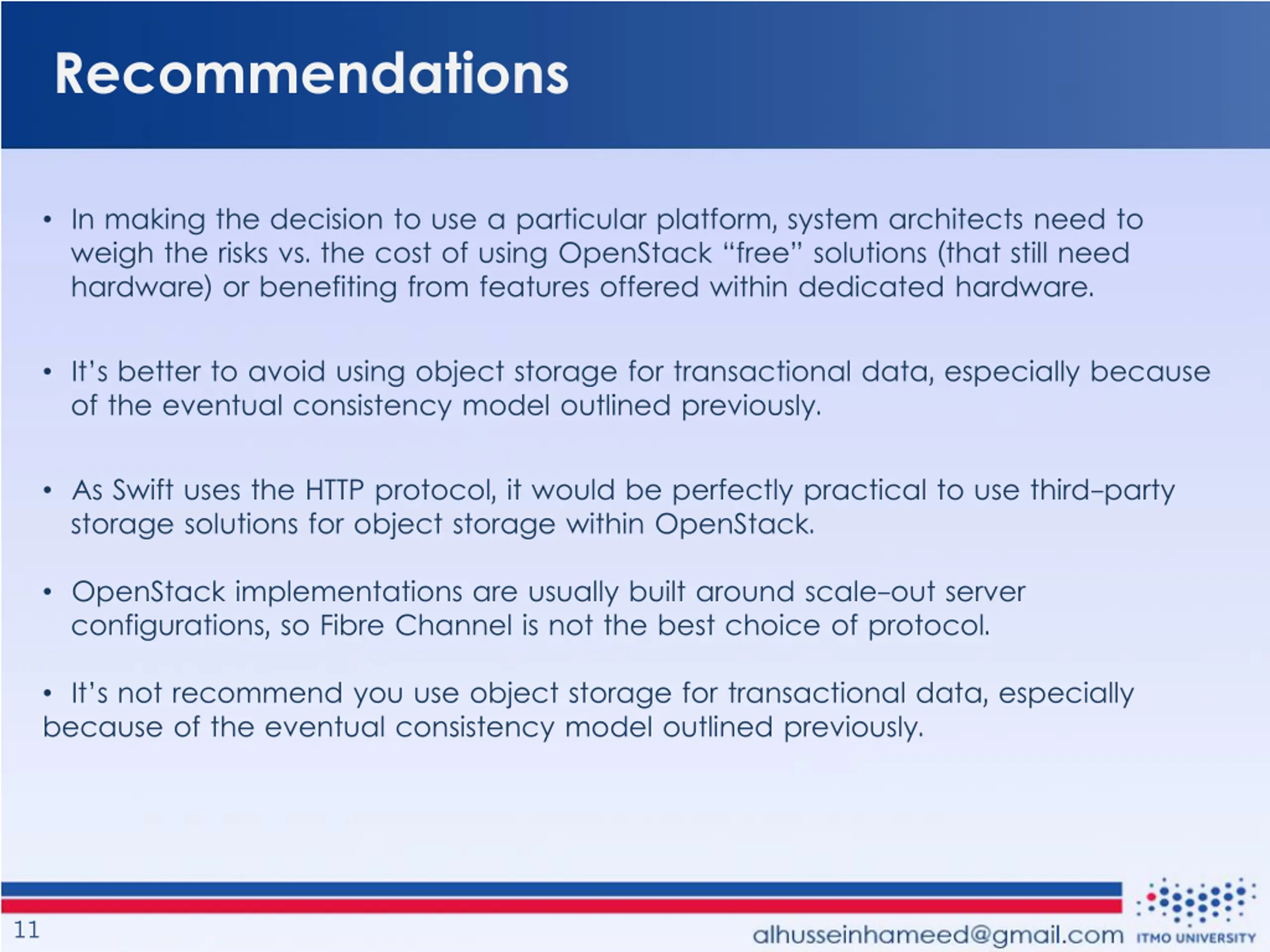 Recommendations In making the decision to use a particular platform, system architects need to weigh the risks vs. the cost of using OpenStack free solutions (that still need hardware) or benefiting from features offered within dedicated hardware. It s better to avoid using object storage for transactional data, especially because of the eventual consistency model outlined previously. As Swift uses the HTTP protocol, it would be perfectly practical to use third-party storage solutions for object storage within OpenStack. OpenStack implementations are usually built around scale-out server configurations, so Fibre Channel is not the best choice of protocol. It s not recommend you use object storage for transactional data, especially because of the eventual consistency model outlined previously. 11