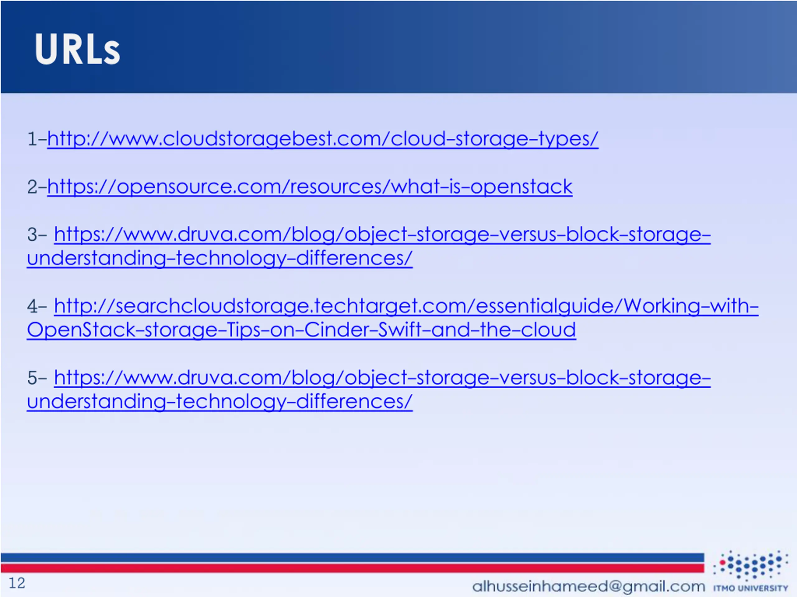 URLs 1-http://www.cloudstoragebest.com/cloud-storage-types/ 2-https://opensource.com/resources/what-is-openstack 3- https://www.druva.com/blog/object-storage-versus-block-storage- understanding-technology-differences/ 4- http://searchcloudstorage.techtarget.com/essentialguide/Working-with- OpenStack-storage-Tips-on-Cinder-Swift-and-the-cloud 5- https://www.druva.com/blog/object-storage-versus-block-storage- understanding-technology-differences/ 12