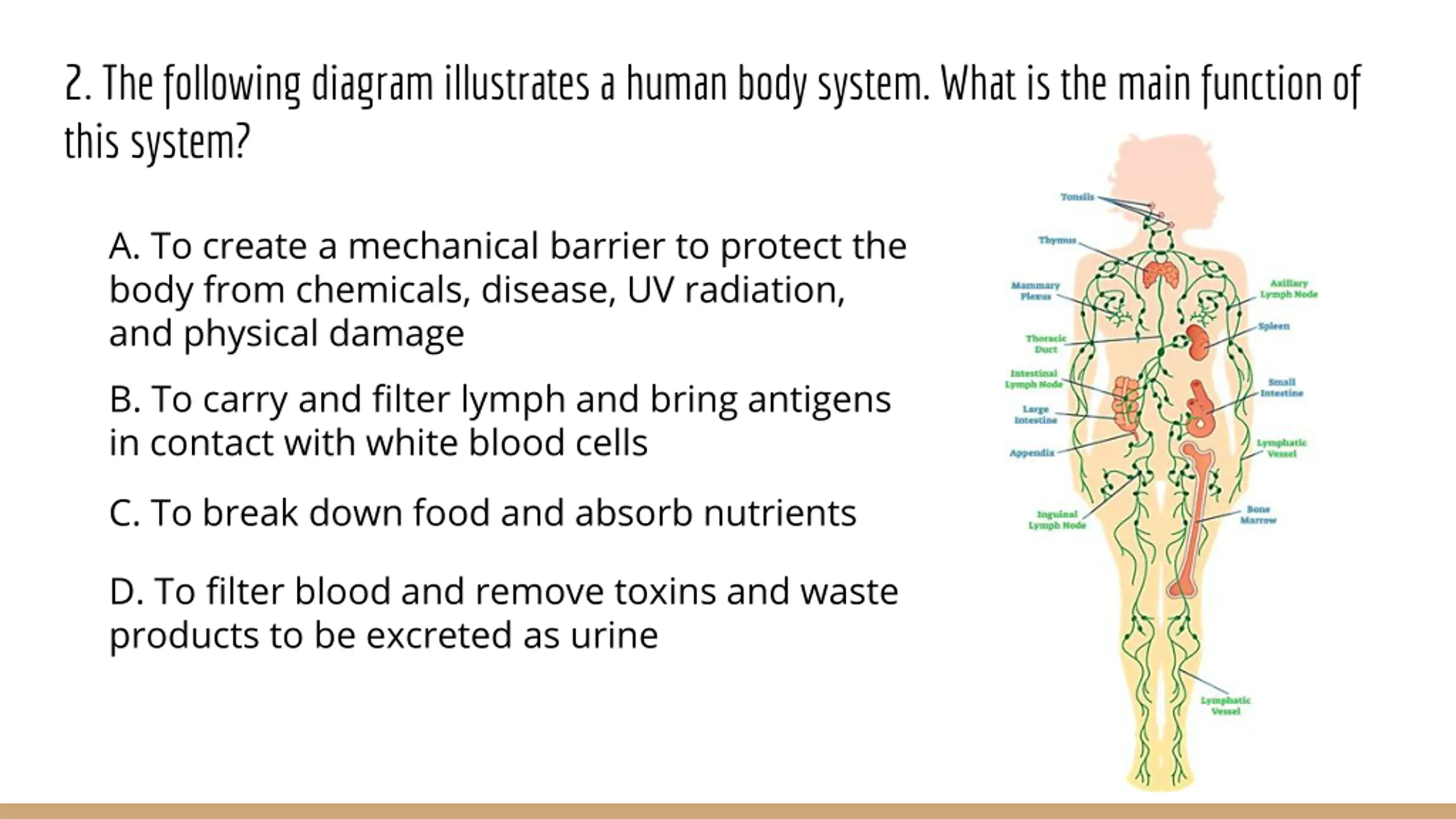 2. The following diagram illustrates a human body system. What is the main function of this system? A. To create a mechanical barrier to protect the body from chemicals, disease, UV radiation, and physical damage B. To carry and filter lymph and bring antigens in contact with white blood cells C. To break down food and absorb nutrients D. To filter blood and remove toxins and waste products to be excreted as urine