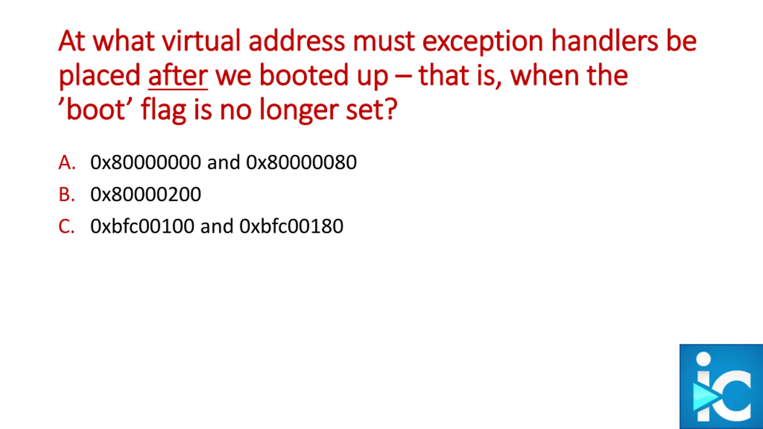 At what virtual address must exception handlers be At what virtual address must exception handlers be placed placed after after we booted up we booted up that is, when the boot flag is no longer set? boot flag is no longer set? that is, when the A. 0x80000000 and 0x80000080 B. 0x80000200 C. 0xbfc00100 and 0xbfc00180