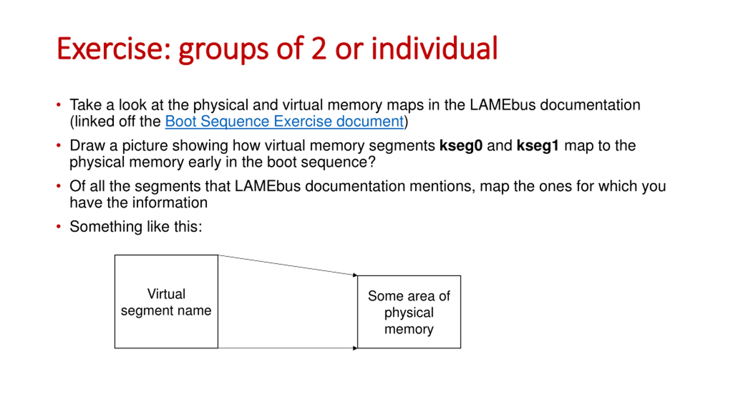 Exercise: groups of 2 or individual Exercise: groups of 2 or individual Take a look at the physical and virtual memory maps in the LAMEbus documentation (linked off the Boot Sequence Exercise document) Draw a picture showing how virtual memory segments kseg0 and kseg1 map to the physical memory early in the boot sequence? Of all the segments that LAMEbus documentation mentions, map the ones for which you have the information Something like this: Virtual Some area of physical memory segment name