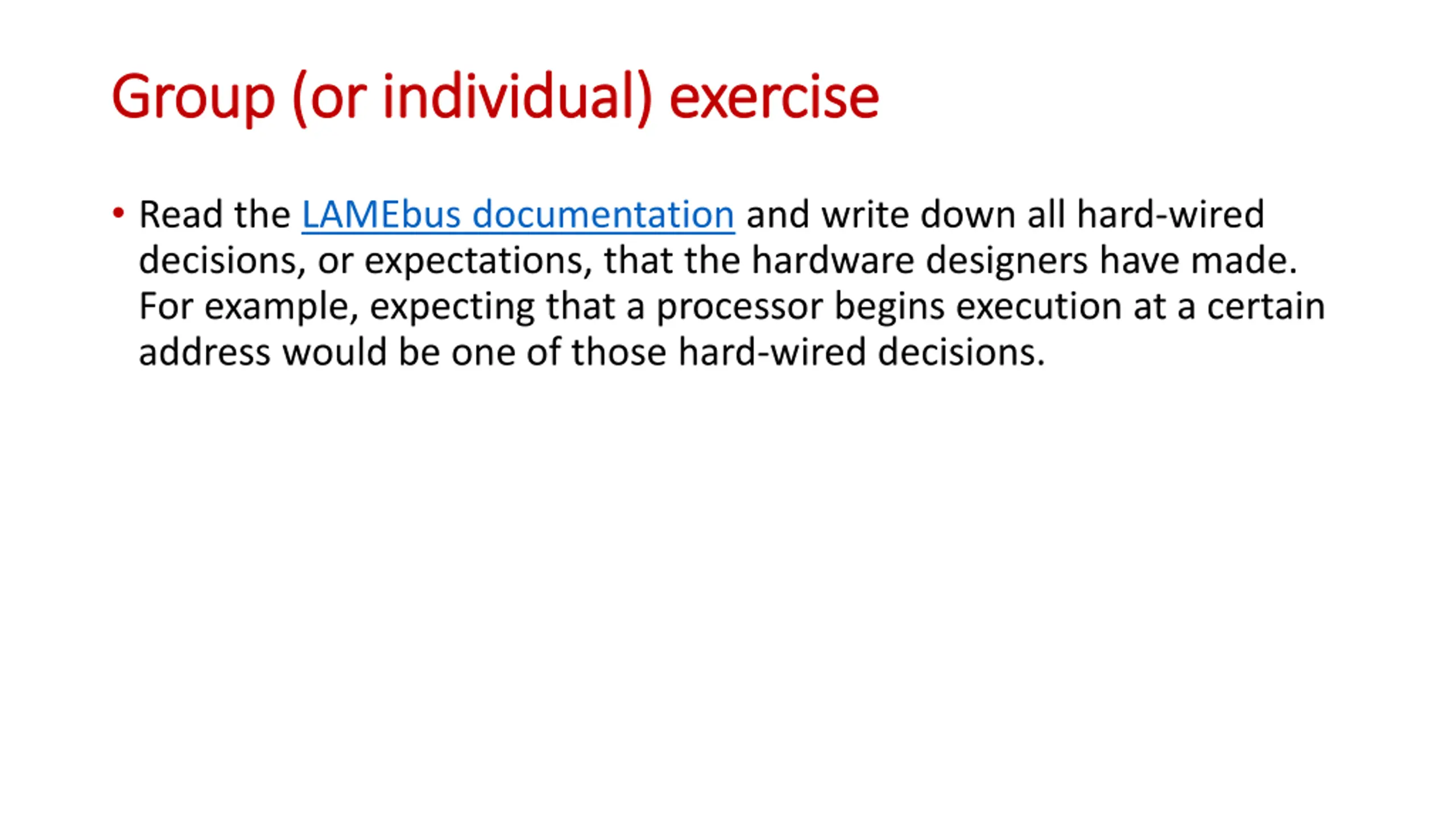 Group (or individual) exercise Group (or individual) exercise Read the LAMEbus documentation and write down all hard-wired decisions, or expectations, that the hardware designers have made. For example, expecting that a processor begins execution at a certain address would be one of those hard-wired decisions.